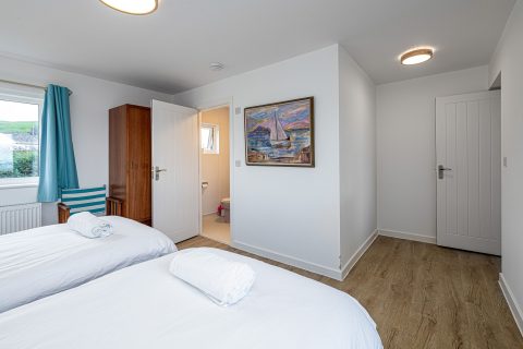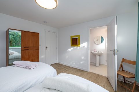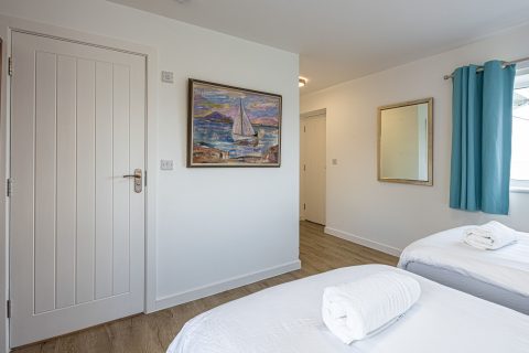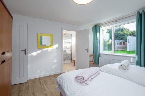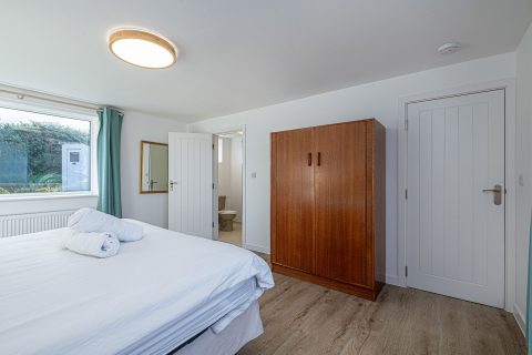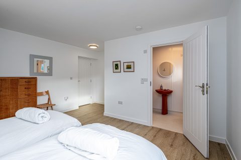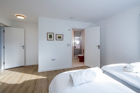 Spacious bedroom with super king-sized bed (zip link can be split to two 3’ singles on request) with double aspect windows and en-suite shower room. En-suite has walk in shower, hand basin, heated towel rail and WC.