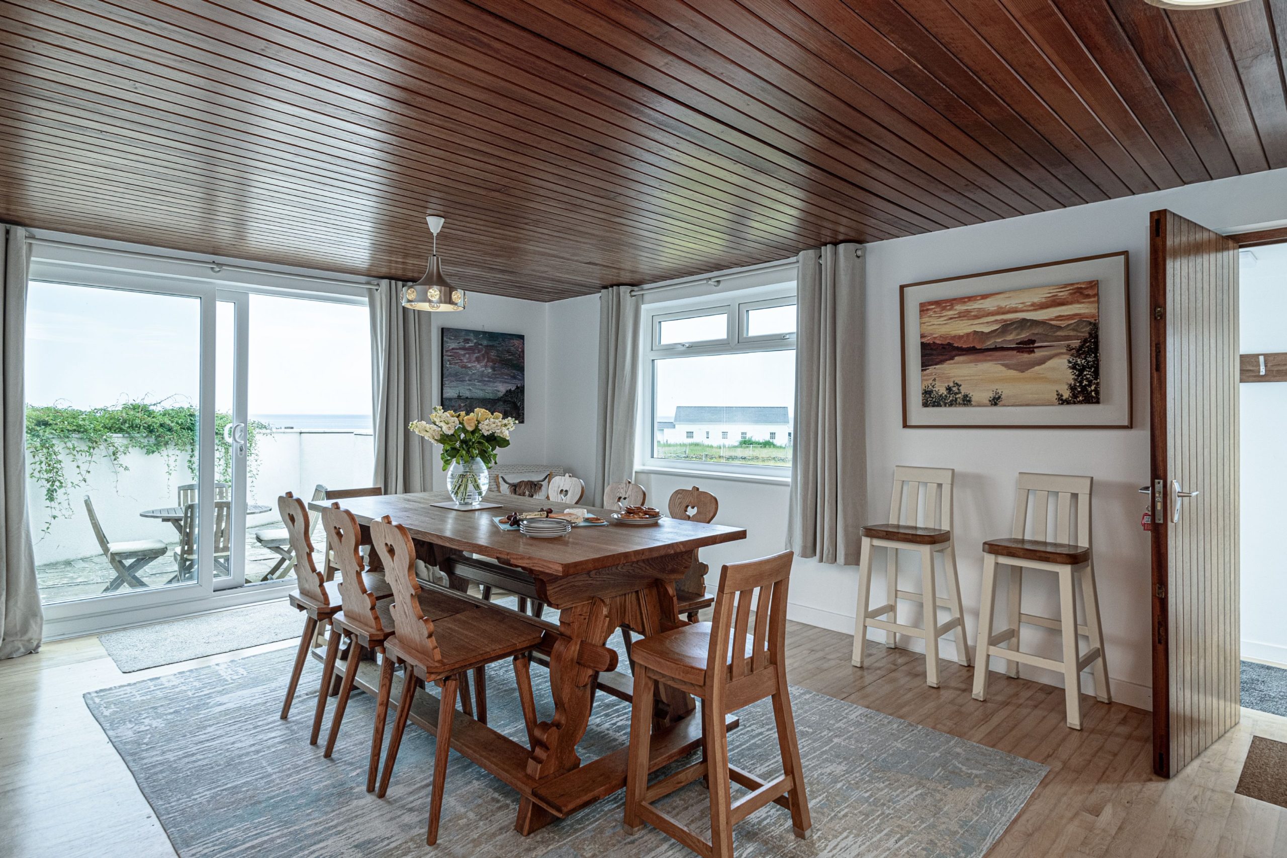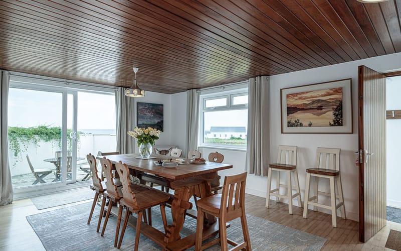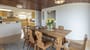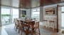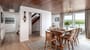 The dining room which opens onto the kitchen and inner hallway has a large dining table to seat 8. There is a sliding patio door which leads to a side patio area with outdoor seating and dining table.