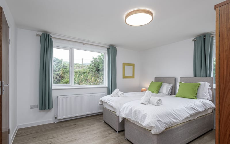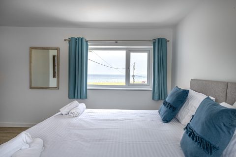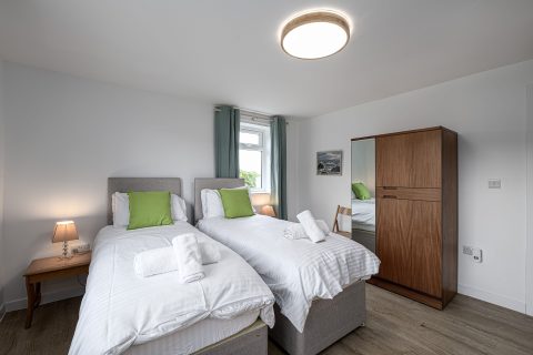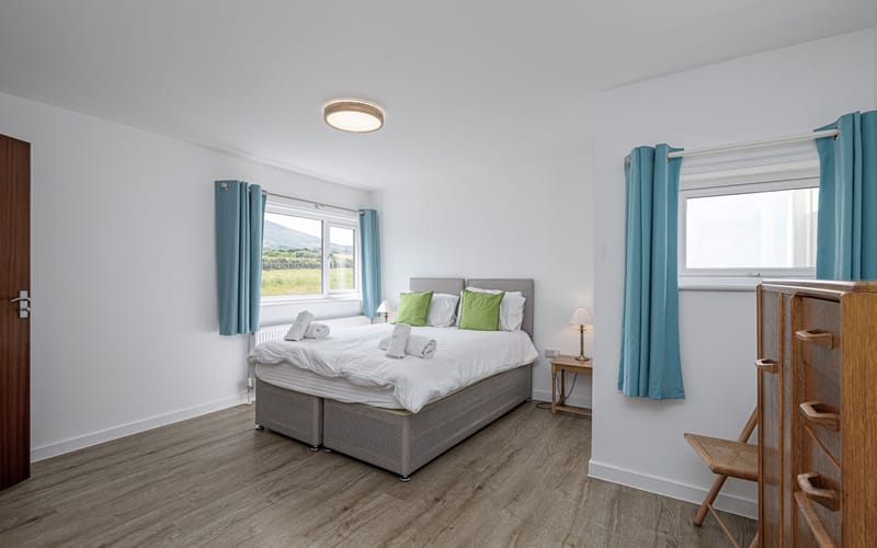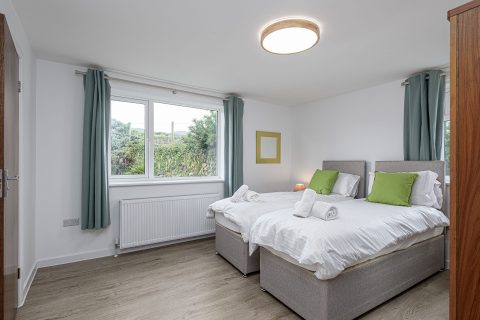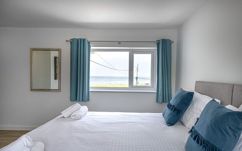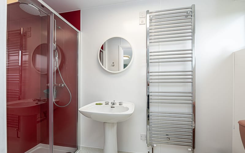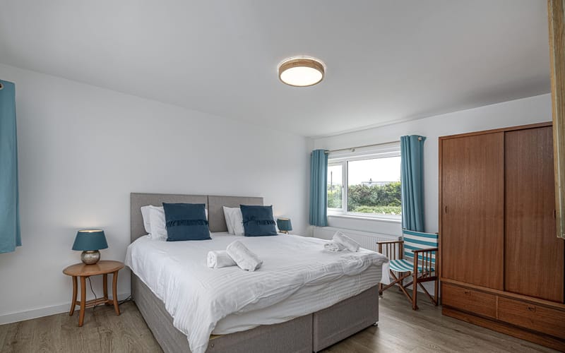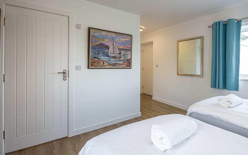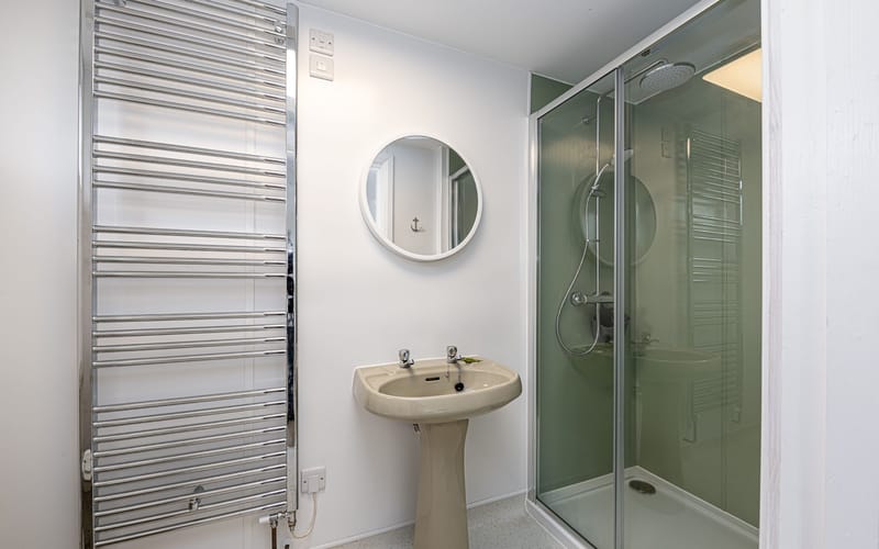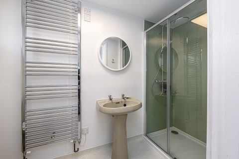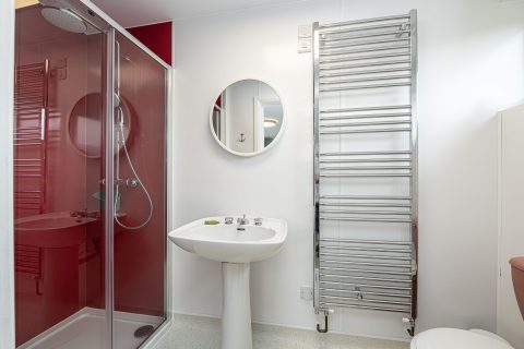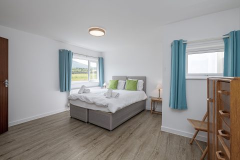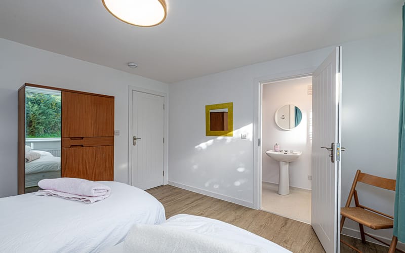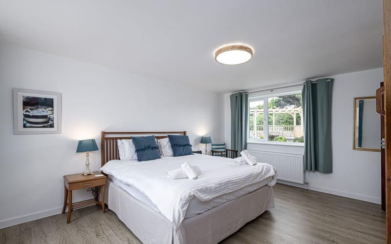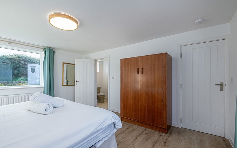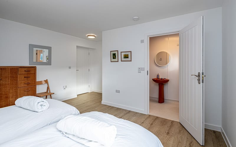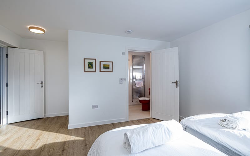 Spacious bedroom with super king-sized bed (zip link can be split to two 3’ singles on request) with double aspect windows and en-suite shower room. En-suite has walk in shower, hand basin, heated towel rail and WC.