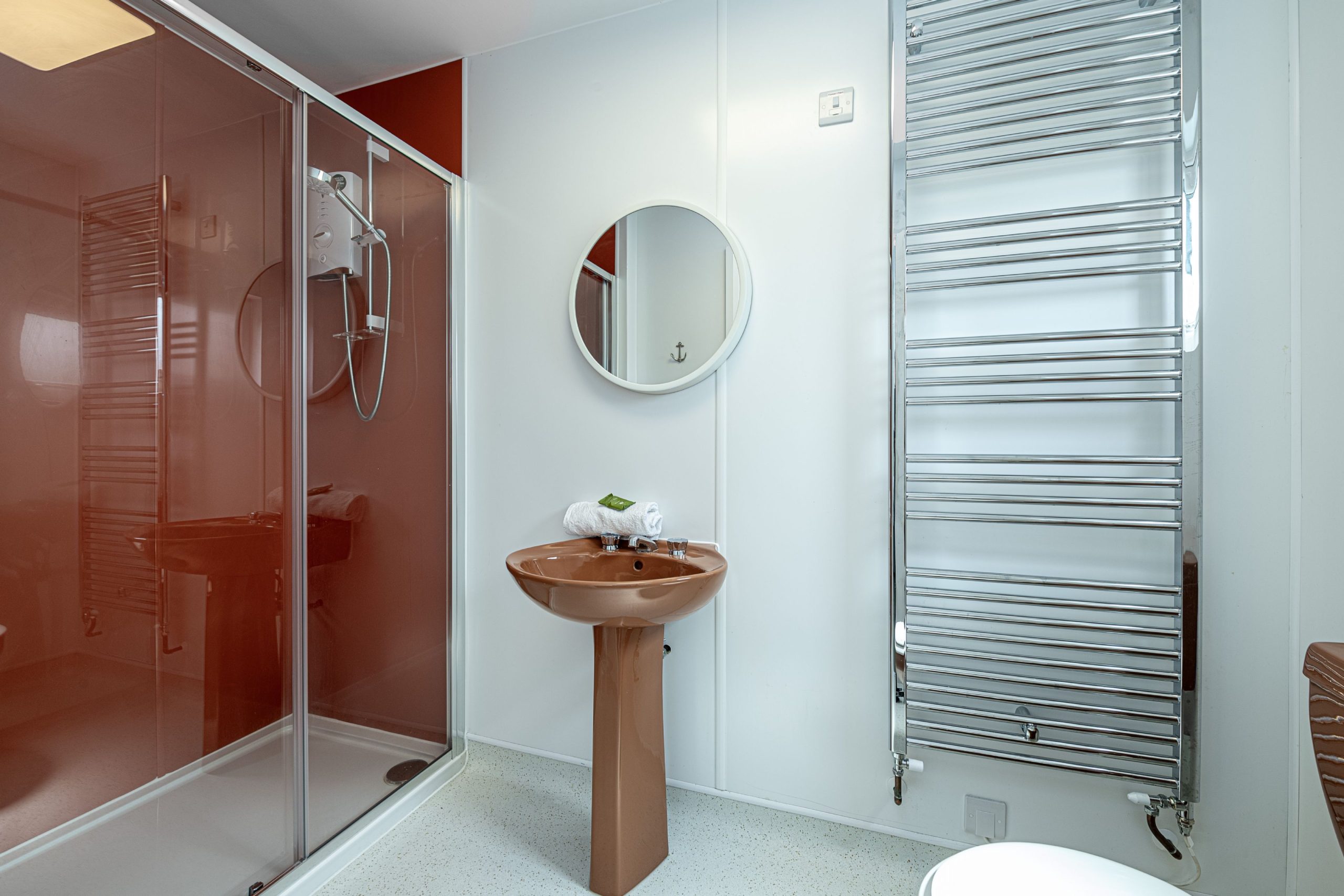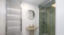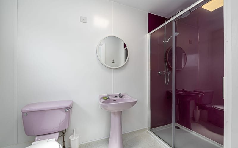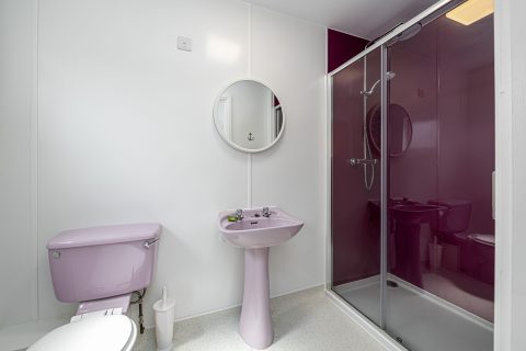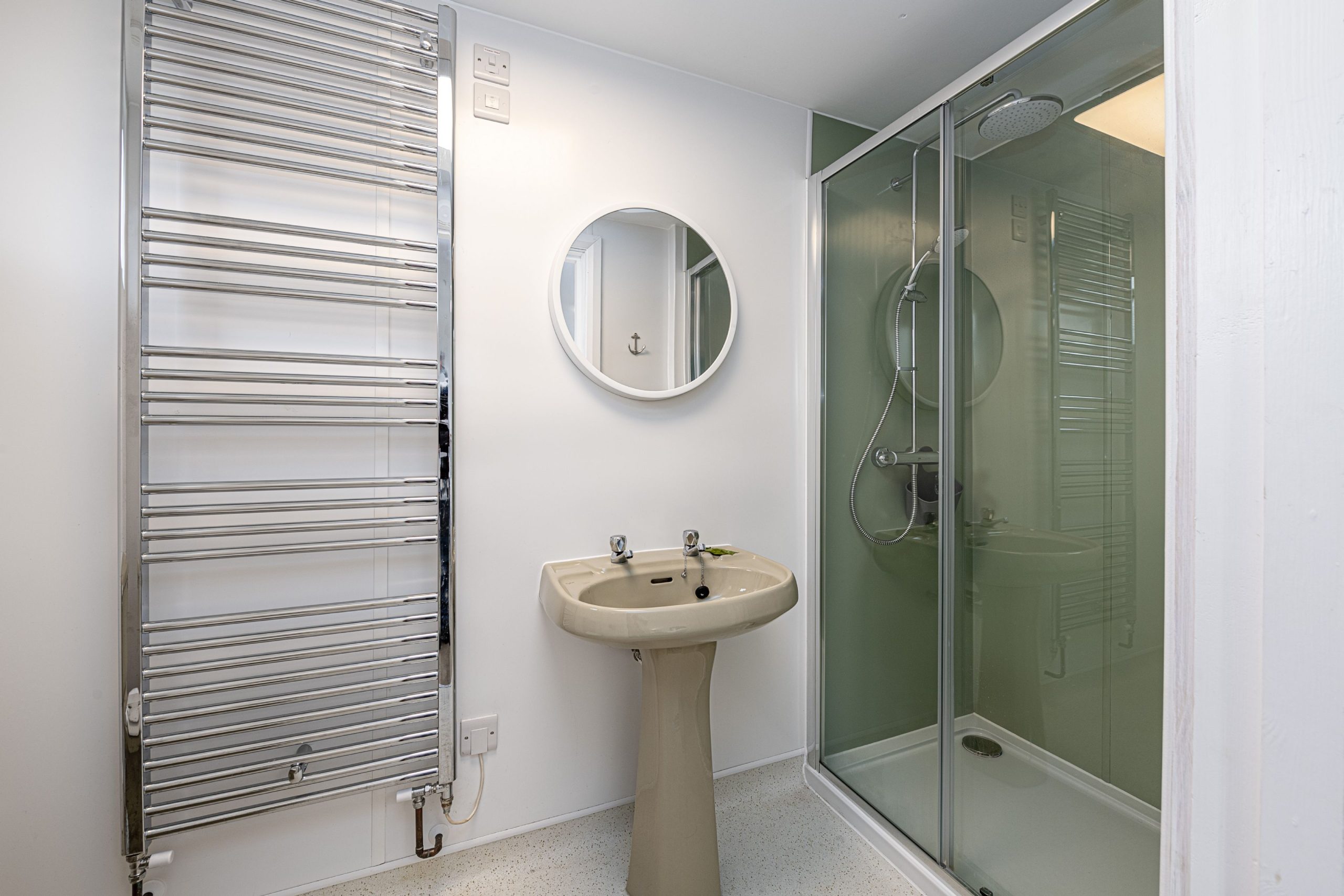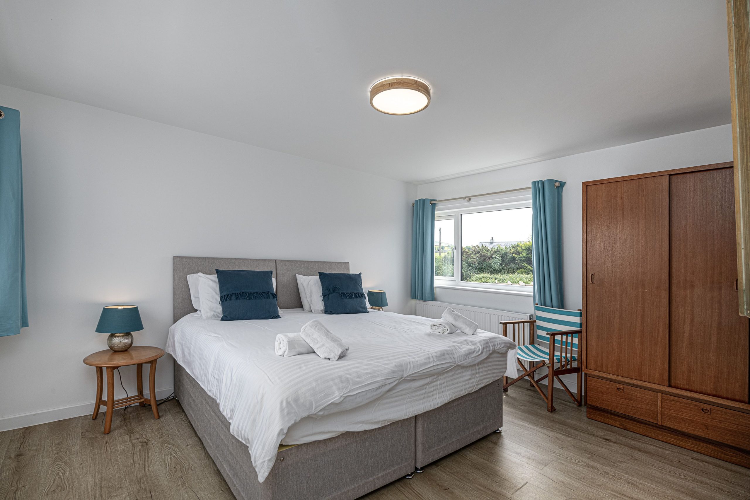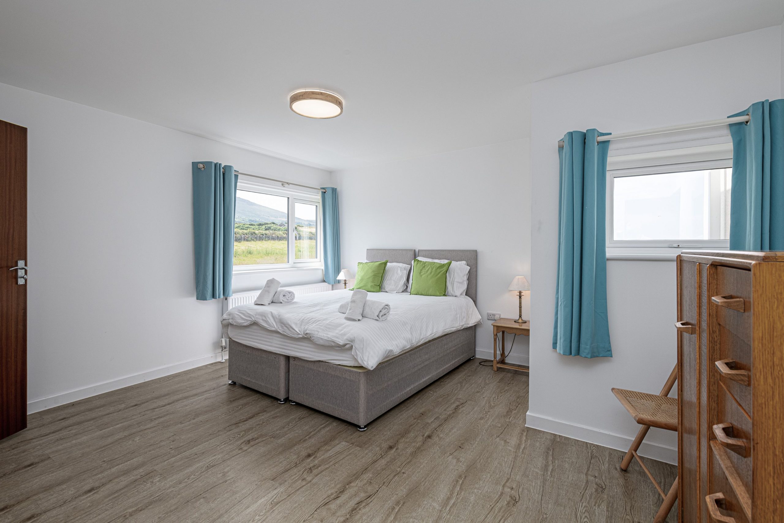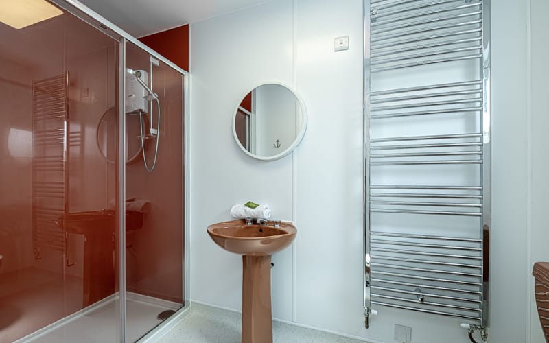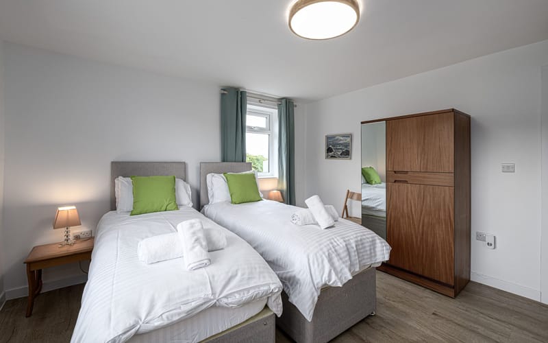 Spacious bedroom with super king-sized bed (zip link can be split to two 3’ singles on request) with double aspect windows and en-suite shower room. En-suite has walk in shower, hand basin, heated towel rail and WC.