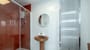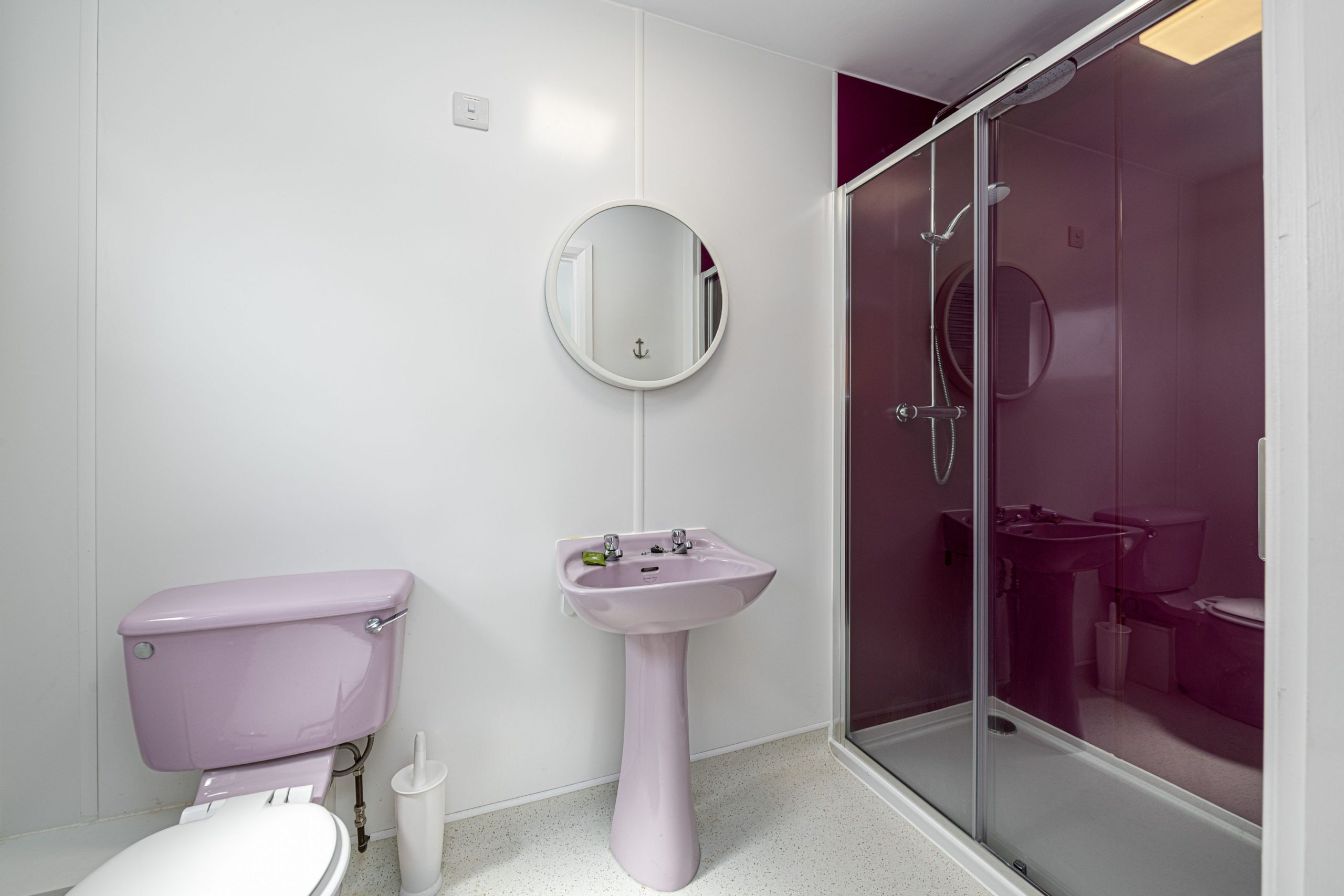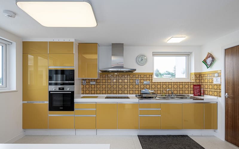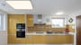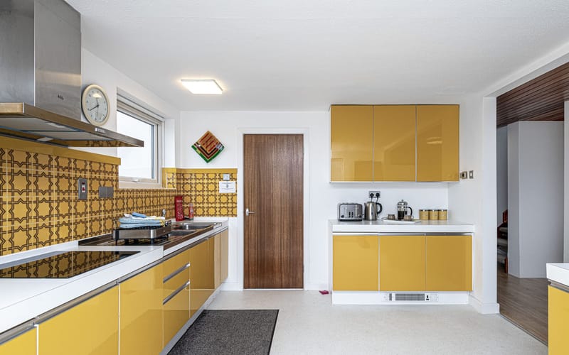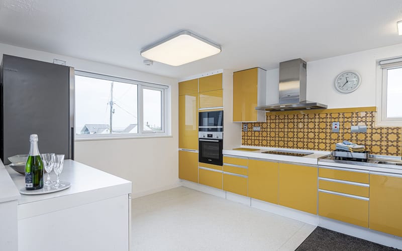 The kitchen is fitted with retro-modern units. It has a built in double sink, microwave, electric oven, induction hob and extractor fan plus a fridge freezer.