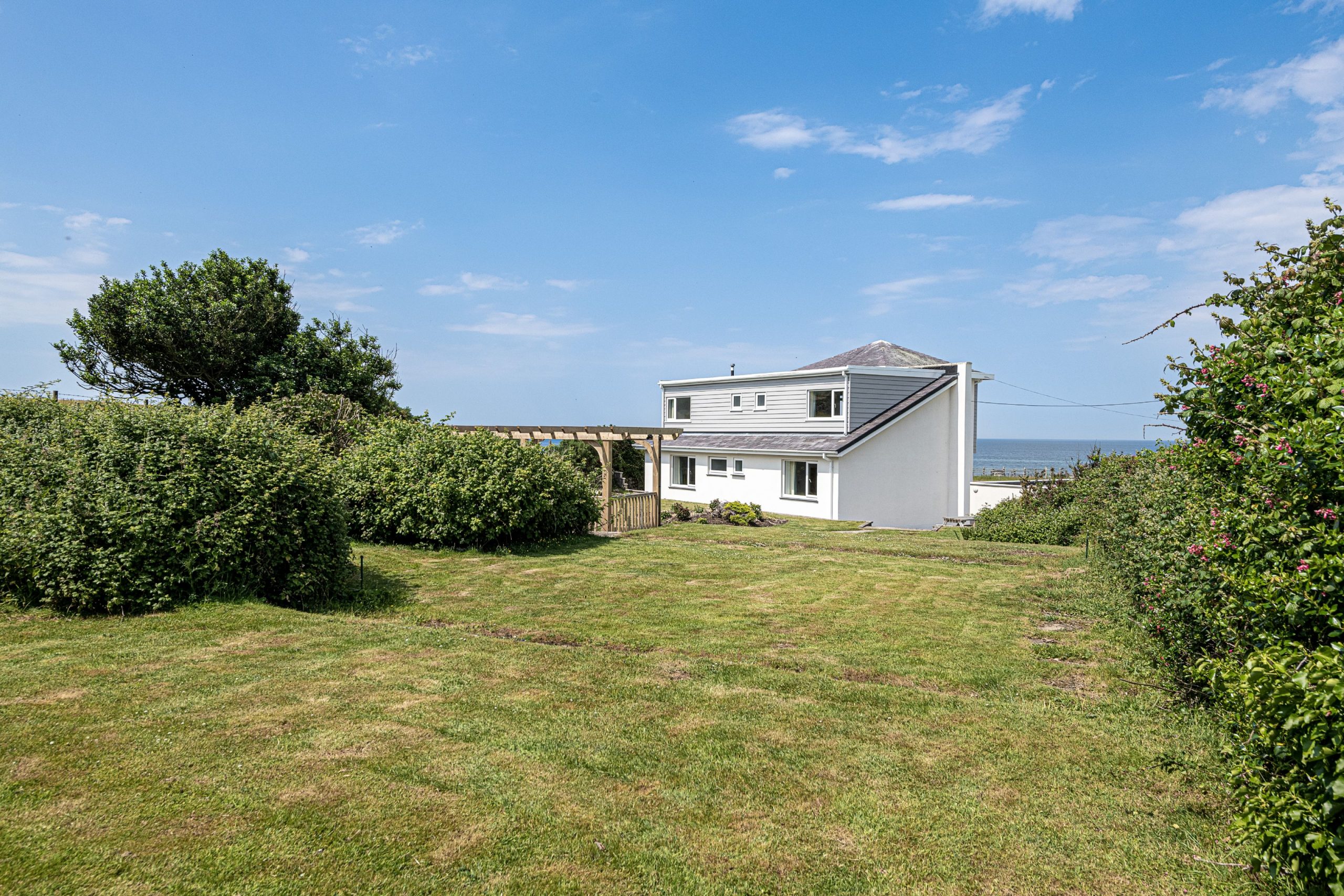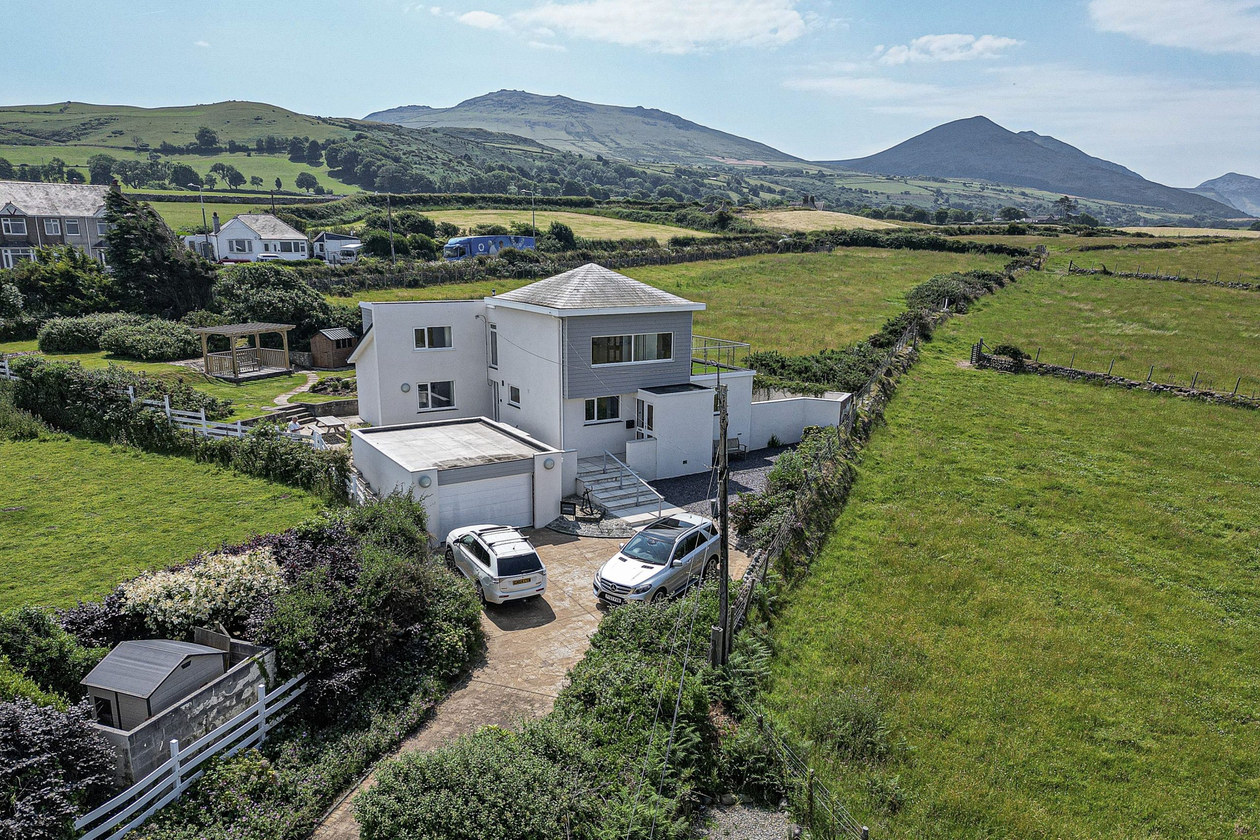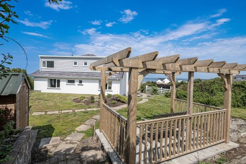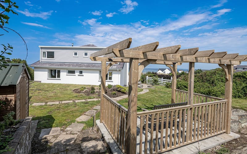 Angorfa has a large enclosed garden with seating areas at both sides of the property. To the front of the house there is plenty of space for parking. The rear garden has a lawn with views to the mountains and to the sea. It also has a seating area in a gazebo.