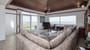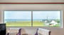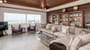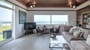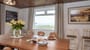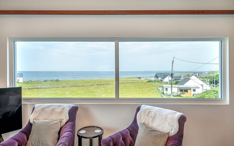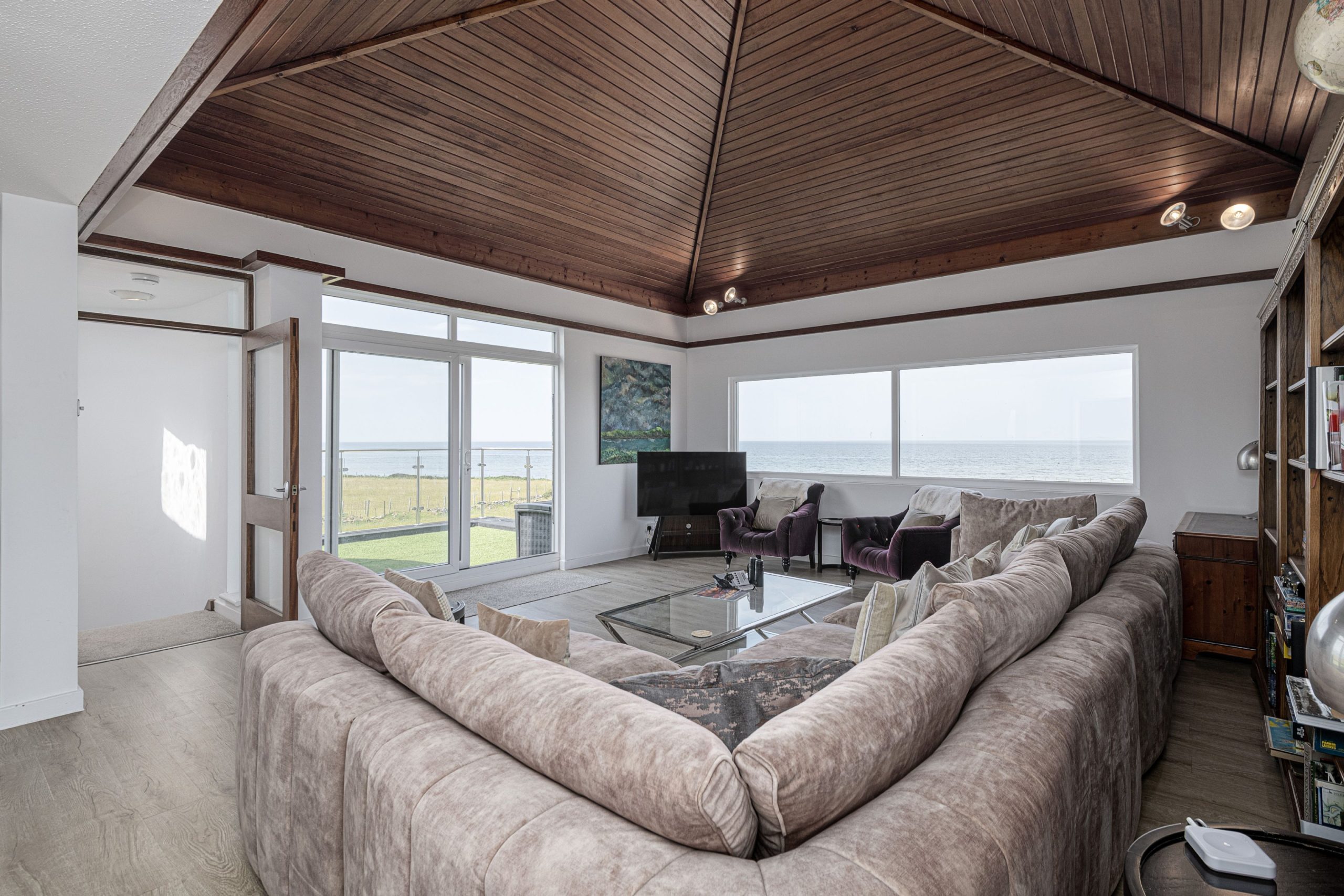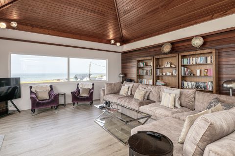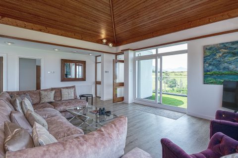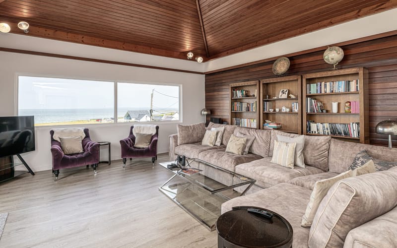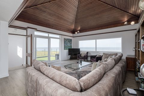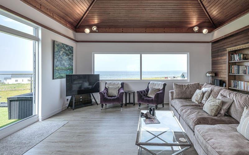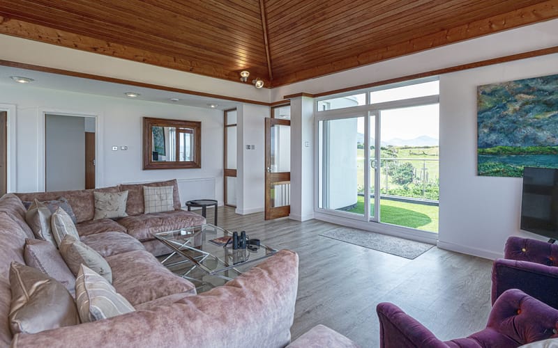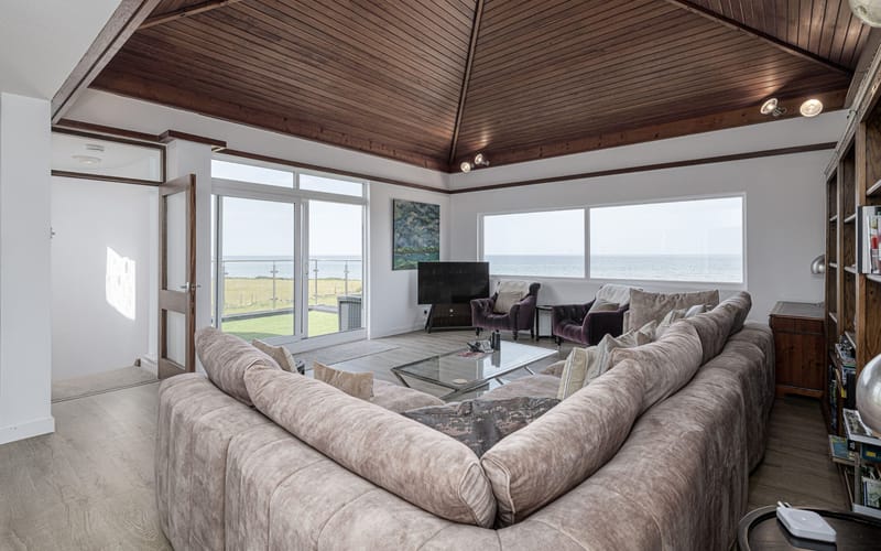 Spacious living area with stunning views to the sea. Large seating area and vaulted wooden ceiling. Sliding patio doors to balcony with views to the sea and the mountains.