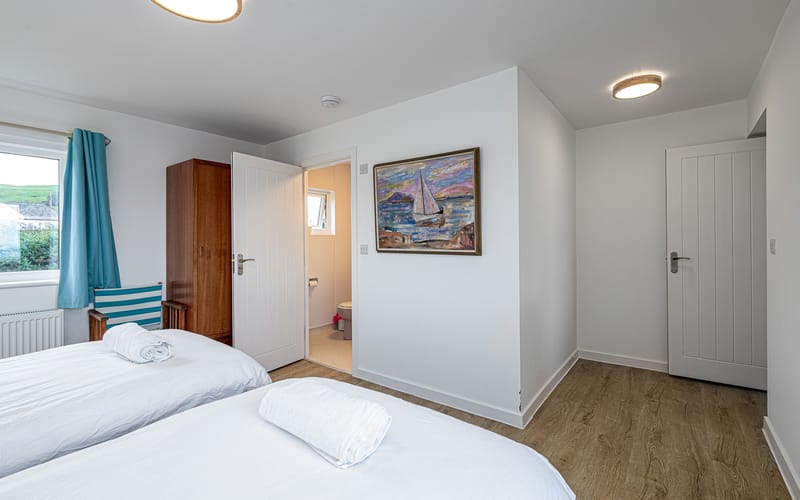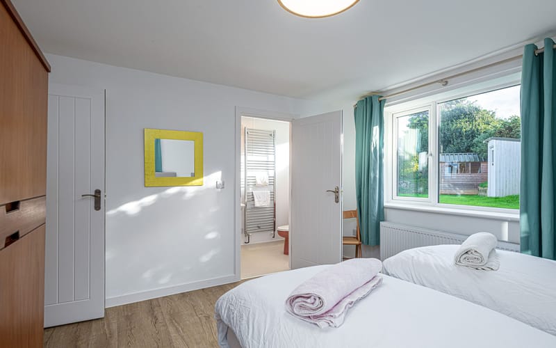 Spacious bedroom with king-sized bed (zip link can be split into two 2’6 singles on request) and double aspect windows. En-suite has walk in shower, hand basin, heated towel rail and WC.