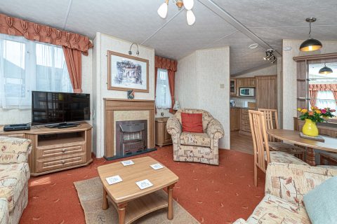 Relax in the cozy lounge area, which features a pull-out sofa bed for additional sleeping arrangements. Guests can enjoy entertainment from the TV and DVD player. A gas fire adds warmth during cooler days. The dining table provides a space for meals and gatherings.