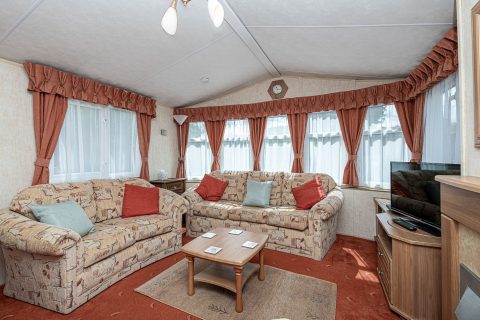 The caravan comprises a main bedroom with an ensuite toilet and sink for added convenience. The second bedroom features twin beds, perfect for accommodating children.