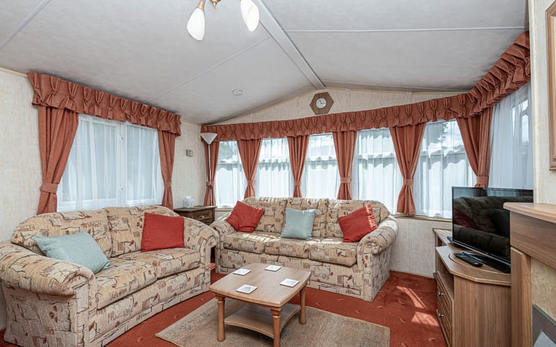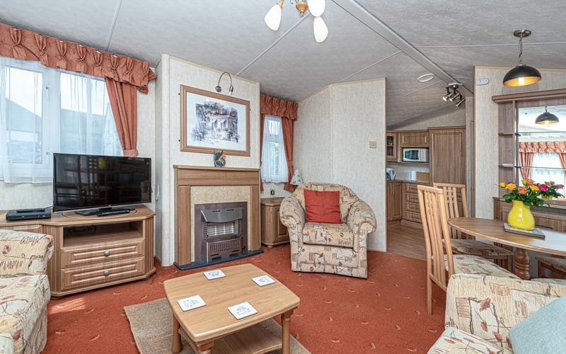 Relax in the cozy lounge area, which features a pull-out sofa bed for additional sleeping arrangements. Guests can enjoy entertainment from the TV and DVD player. A gas fire adds warmth during cooler days. The dining table provides a space for meals and gatherings.