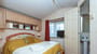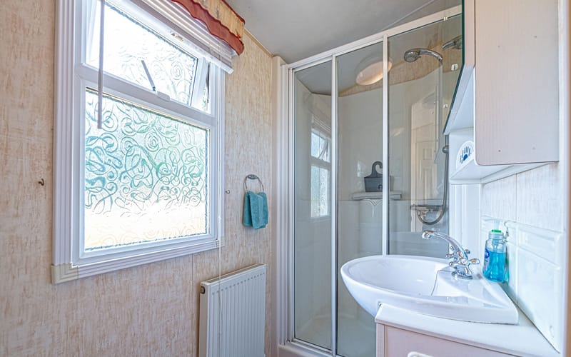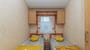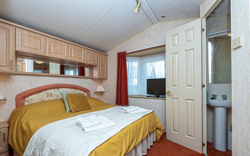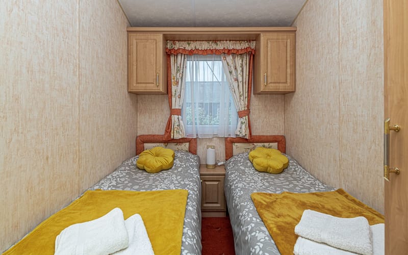 The caravan comprises a main bedroom with an ensuite toilet and sink for added convenience. The second bedroom features twin beds, perfect for accommodating children.