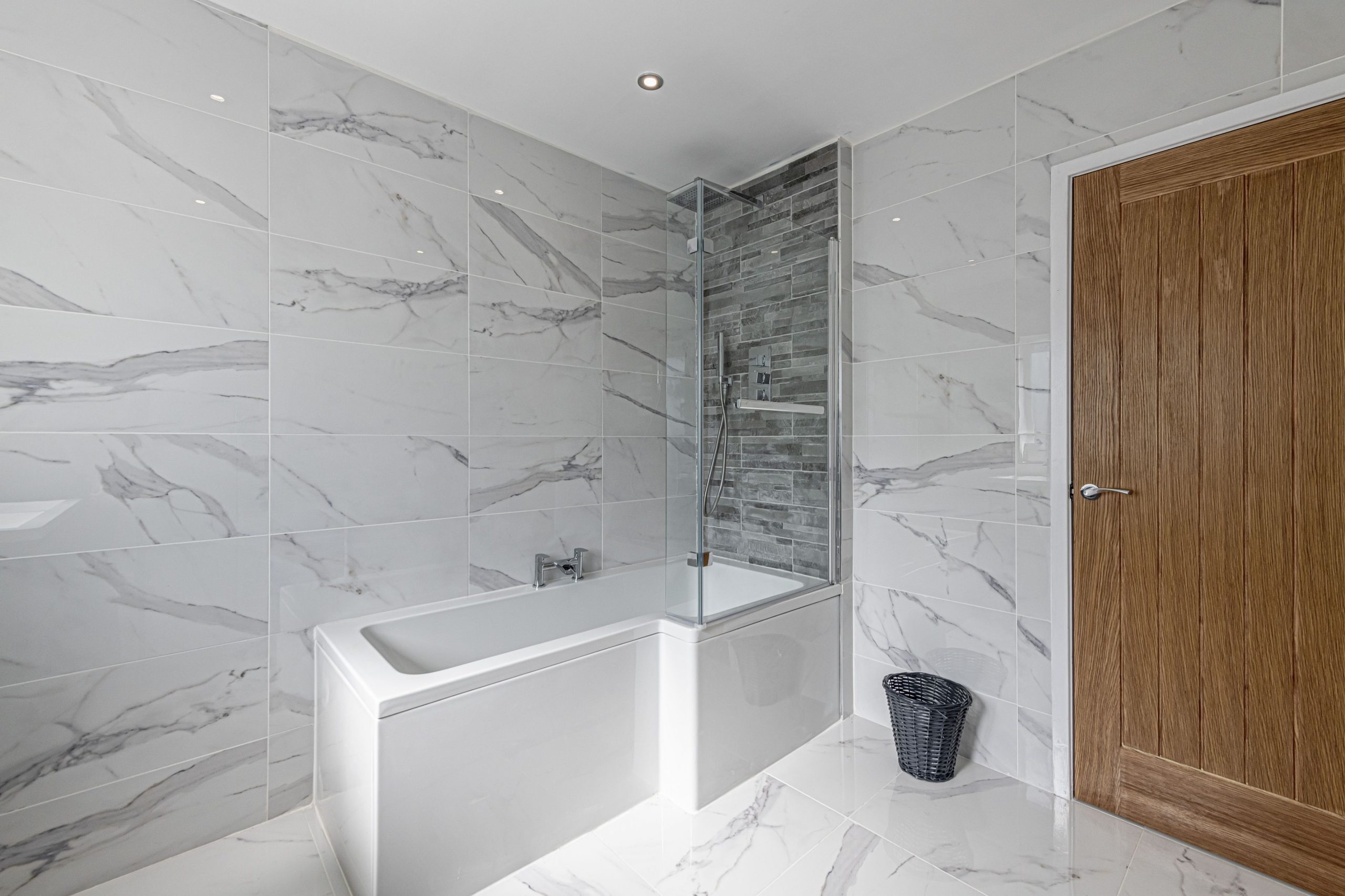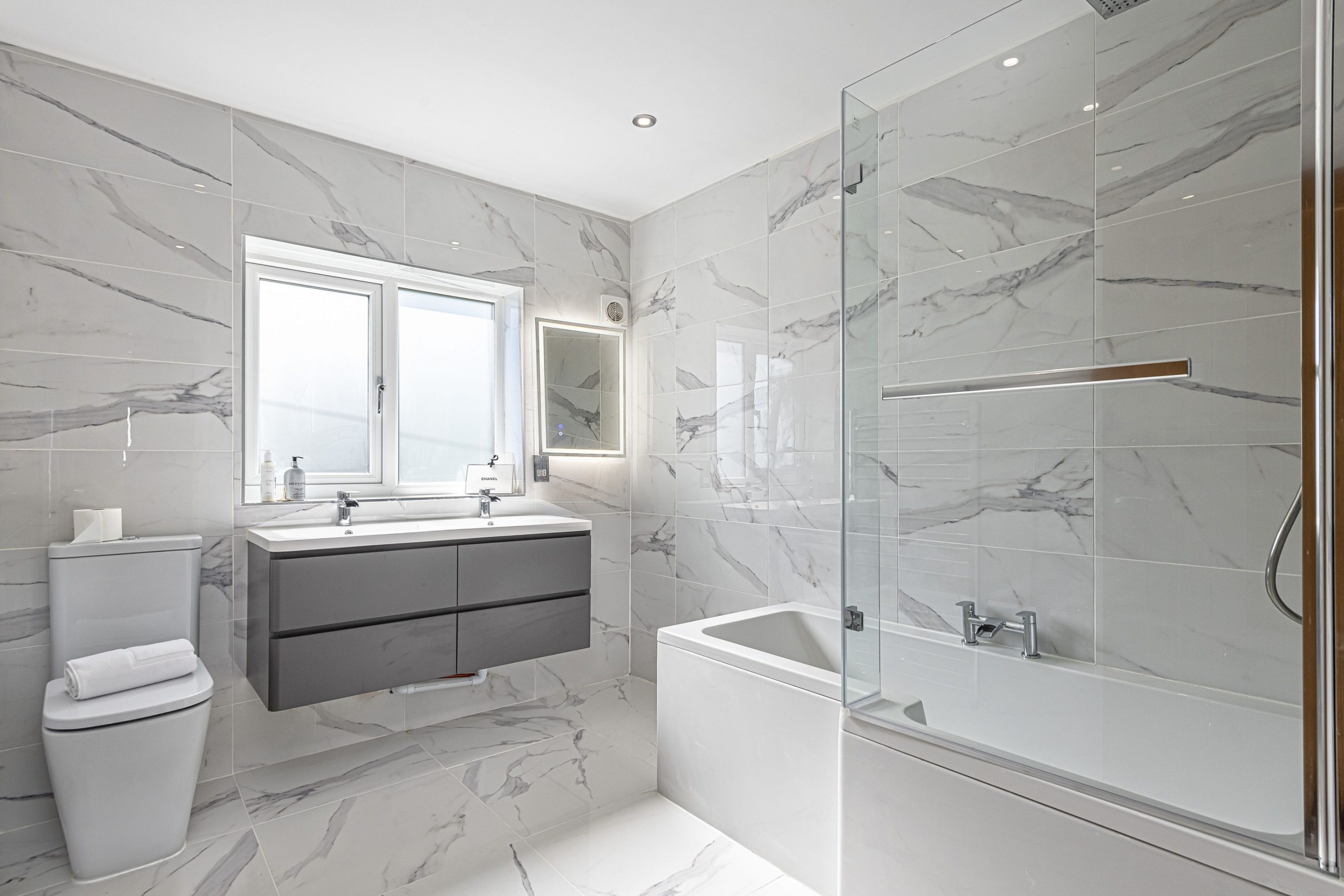 You have 2 bedrooms downstairs, one of which is master bedroom with en-suite toilet basin and shower. The main bathroom is a brand-new marble bathroom with a large L shape bath and shower, toilet and ‘’his ‘n’ hers’’ double sinks.