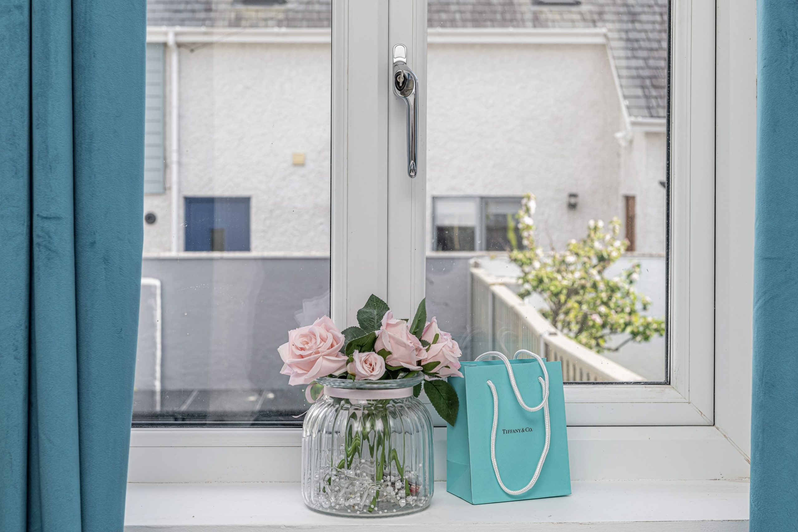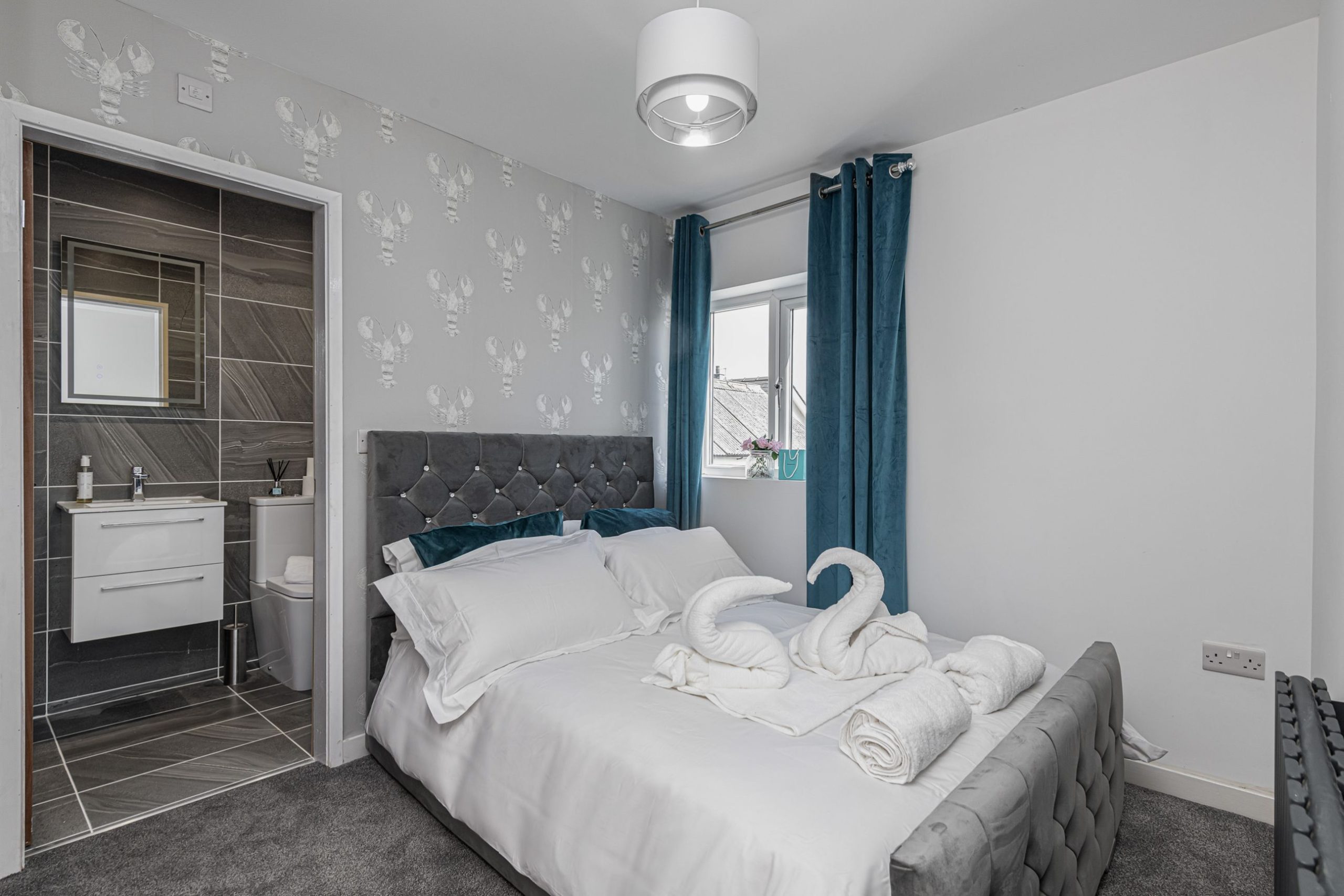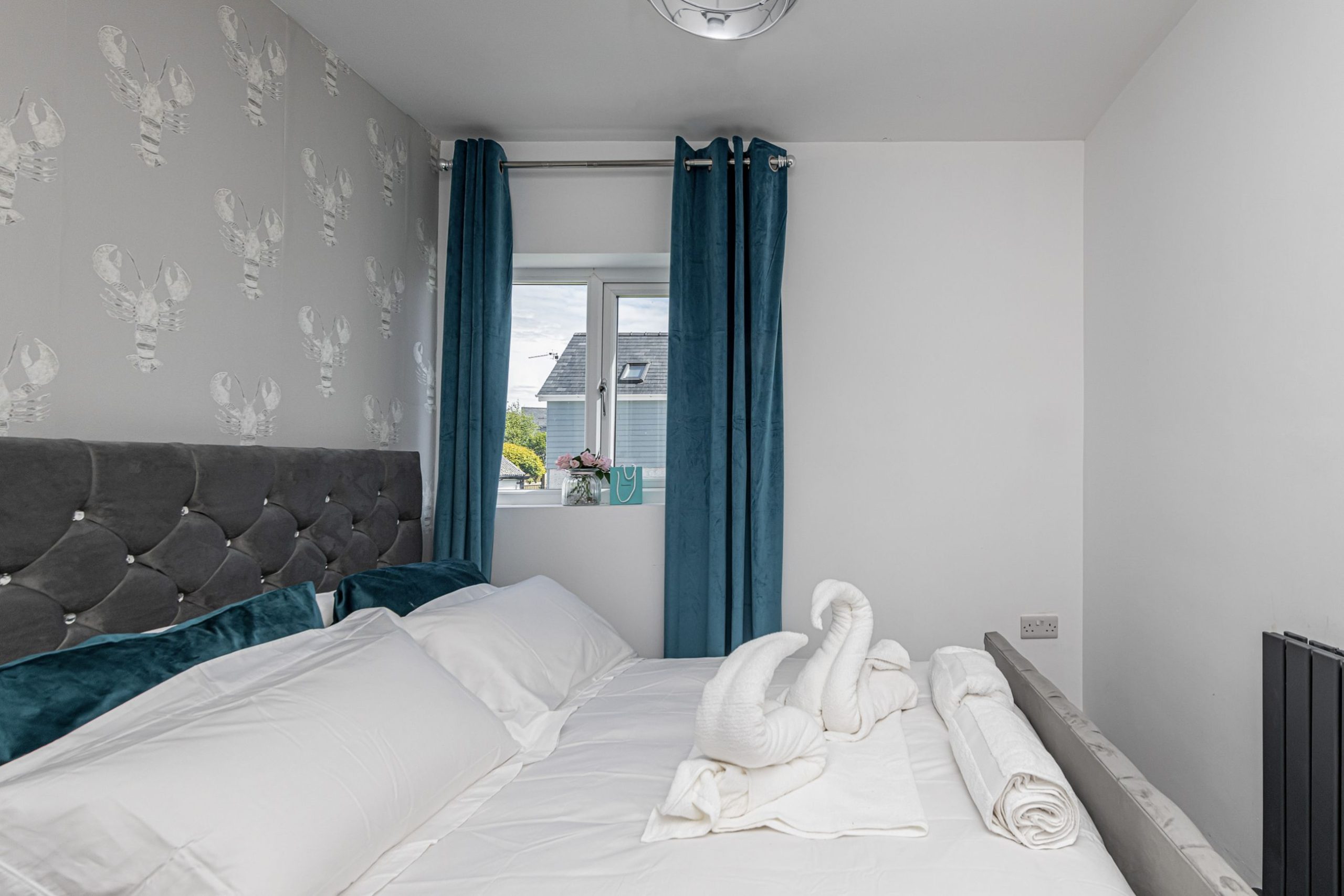 Master bedroom is tastefully decorated with an upholstered double bed, velvet teal curtains, built in ward robes and modern furnishings.