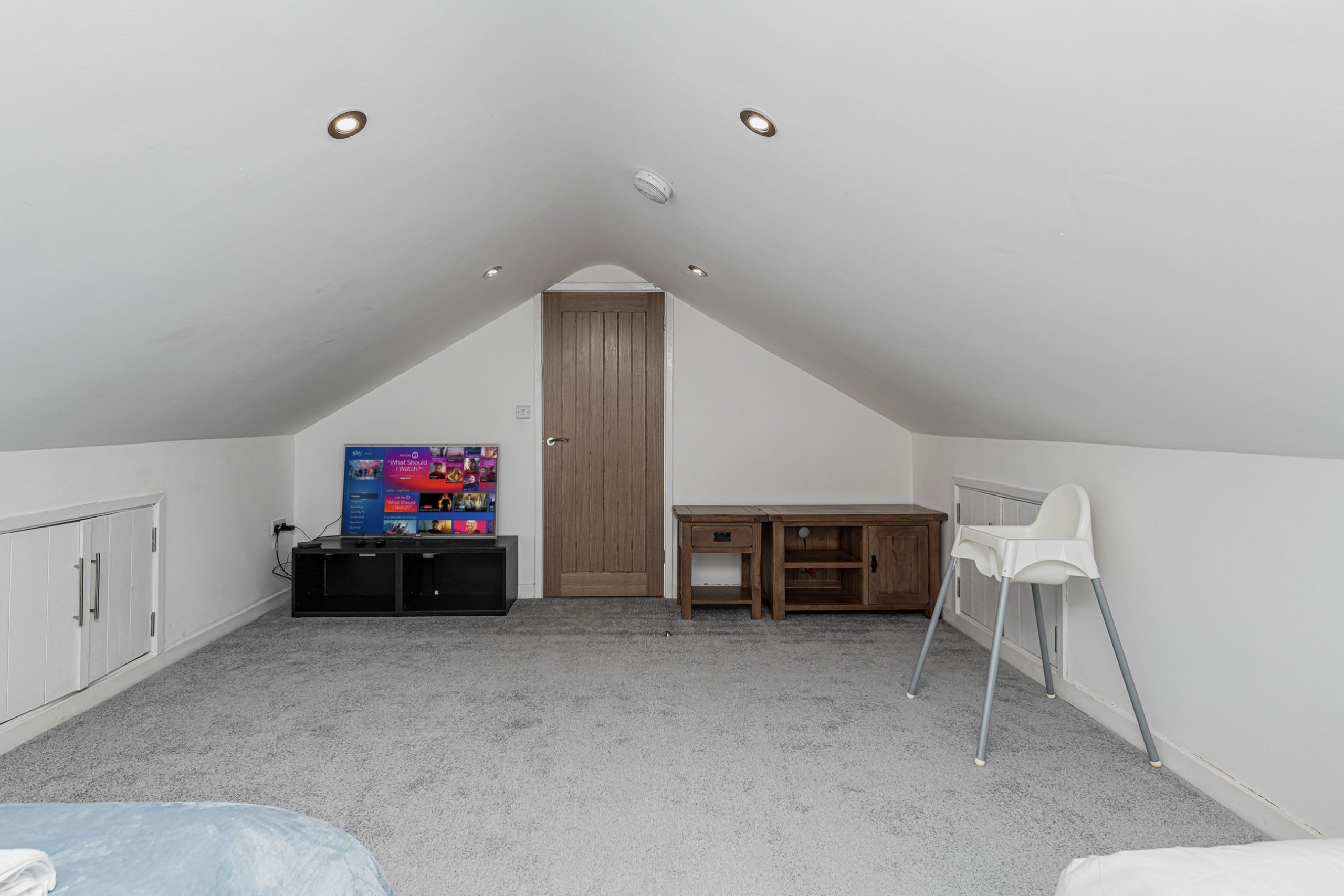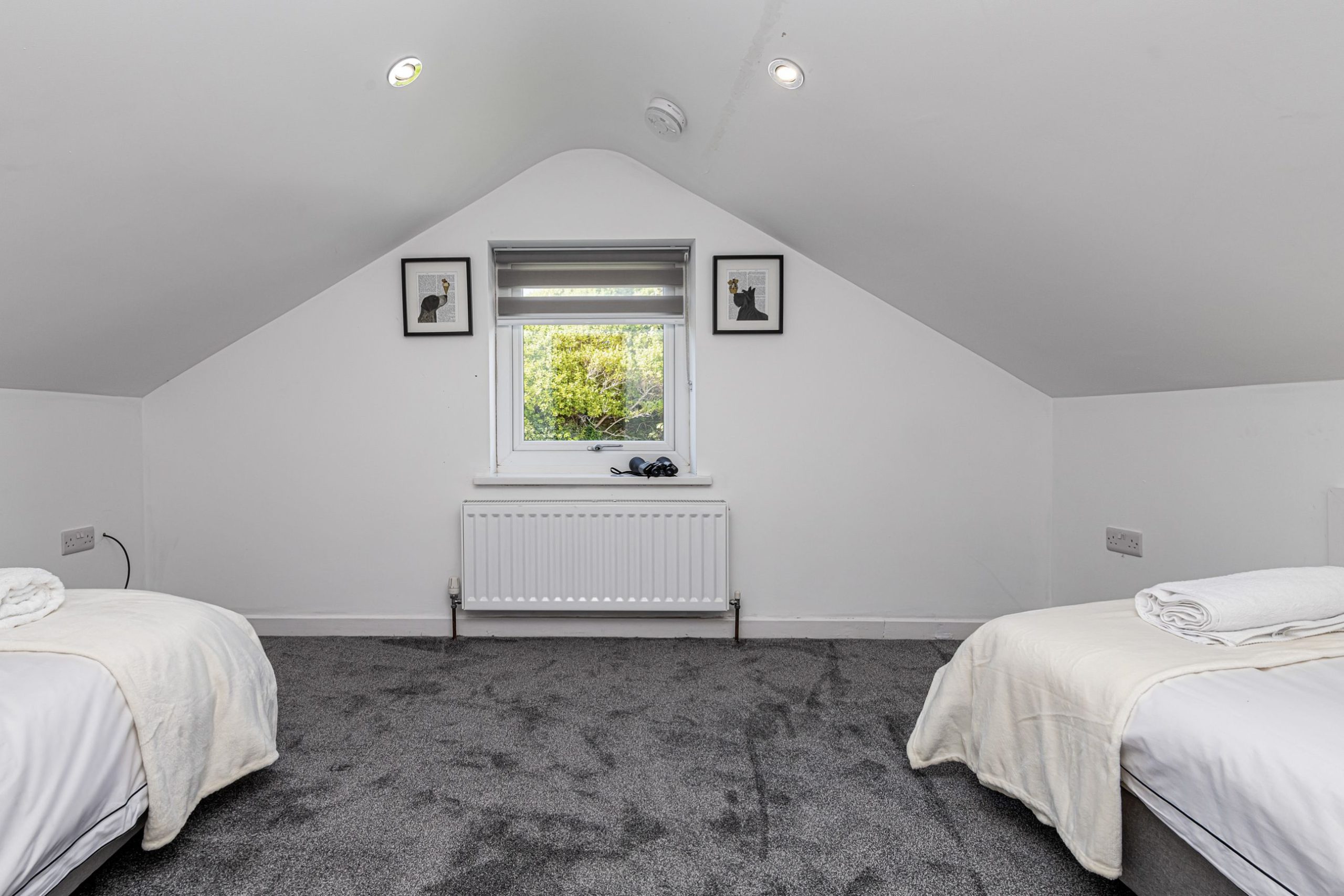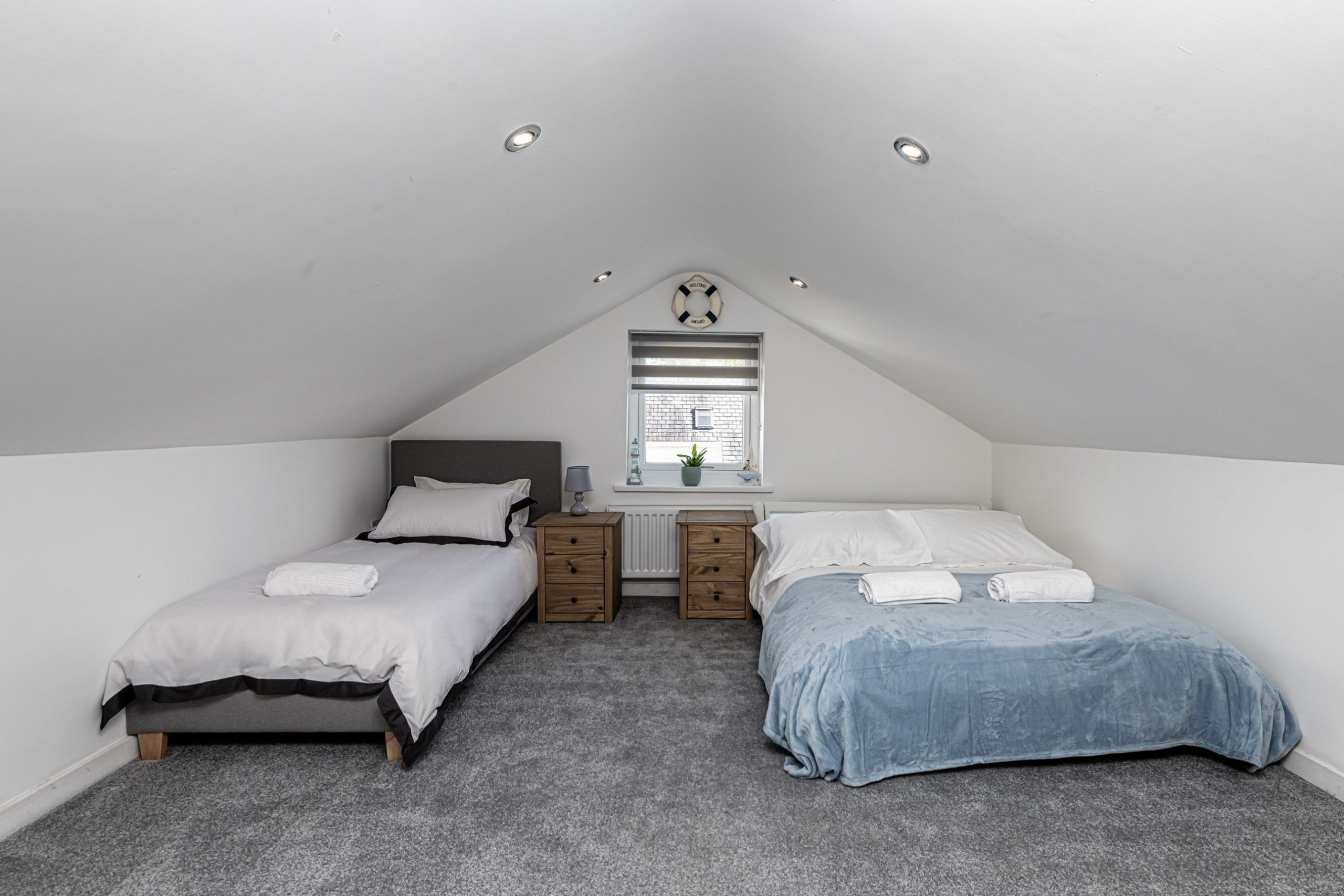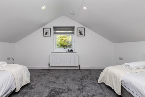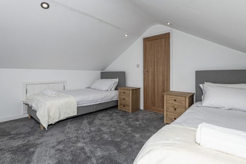 Modern glass and oak stairs lead to upstairs 2 bedrooms with double sci-fi space bed, and 5 m long bedrooms with TV and sky box. both of the spacious and bright bedrooms can be configured as twins or king size beds.