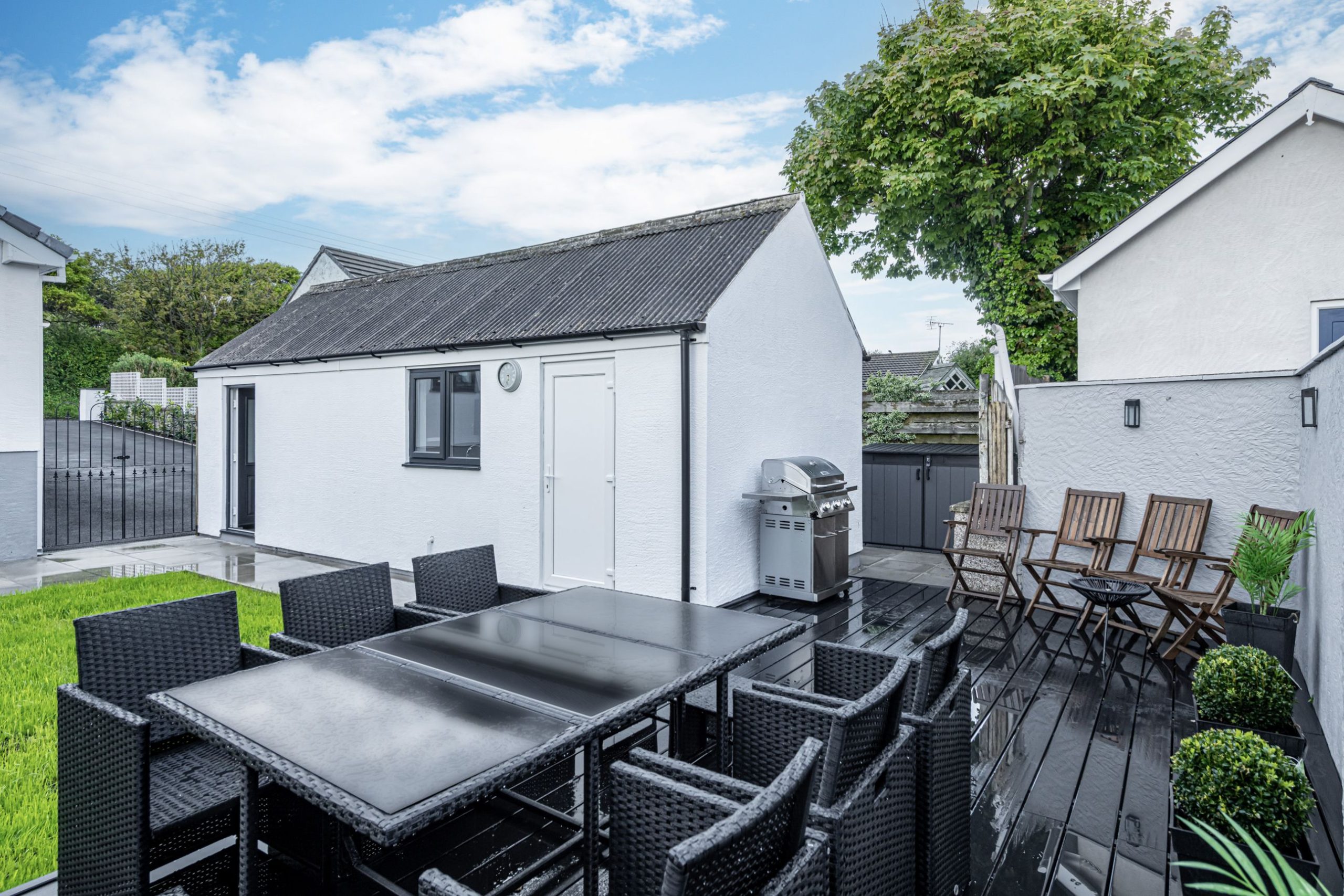 The enclosed back garden and patio area provide secure gated rear gardens laid to lawn, perfect for children and dogs, large decking area, outdoor dining area, pizza oven and gas BBQ.