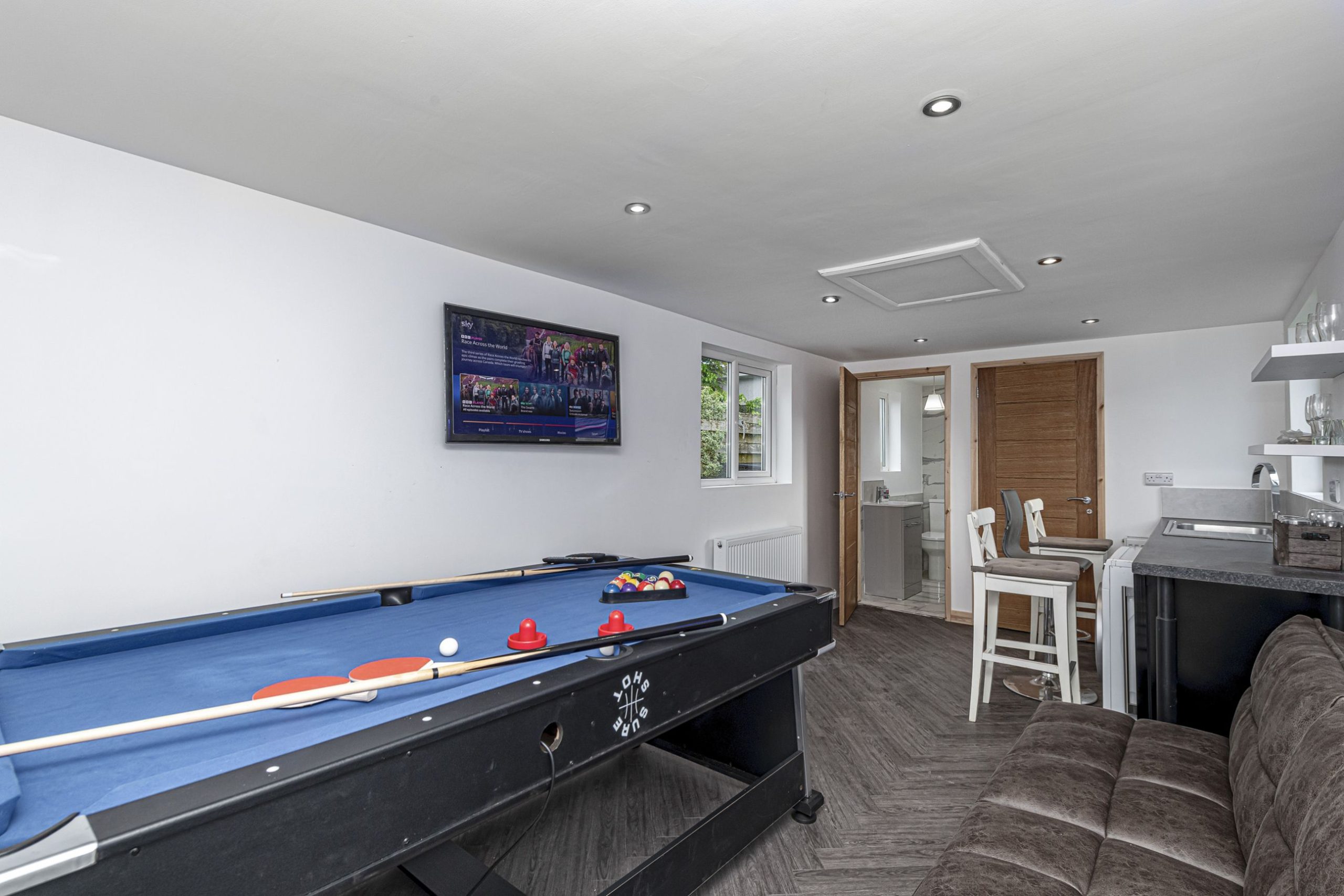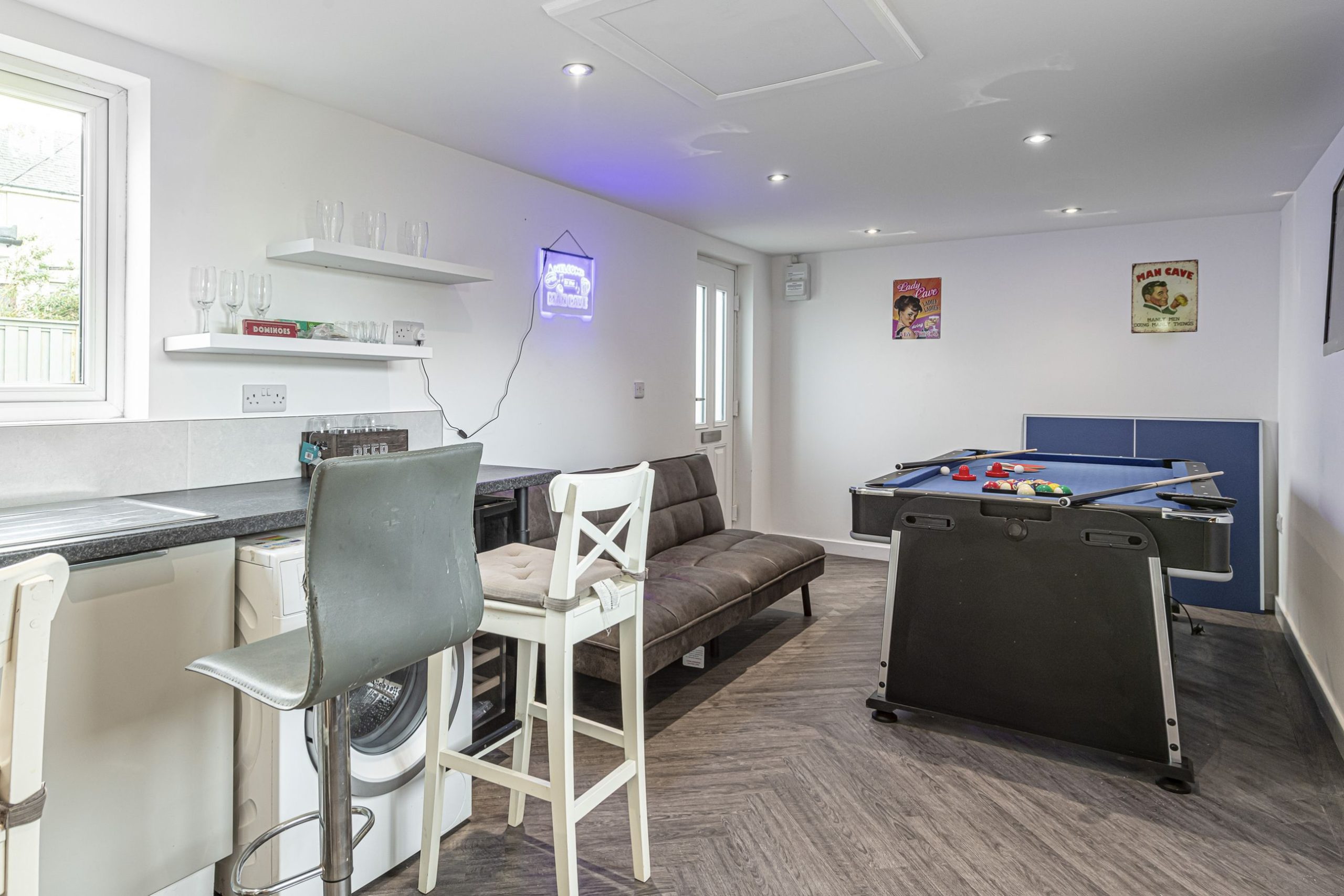 Within the back gardens is the Games room with Sky TV with Sports package, bar area, drinks fridge, pool table, ping pong and air hockey tables as a man and lady cave. Perfect escape for any rainy days.