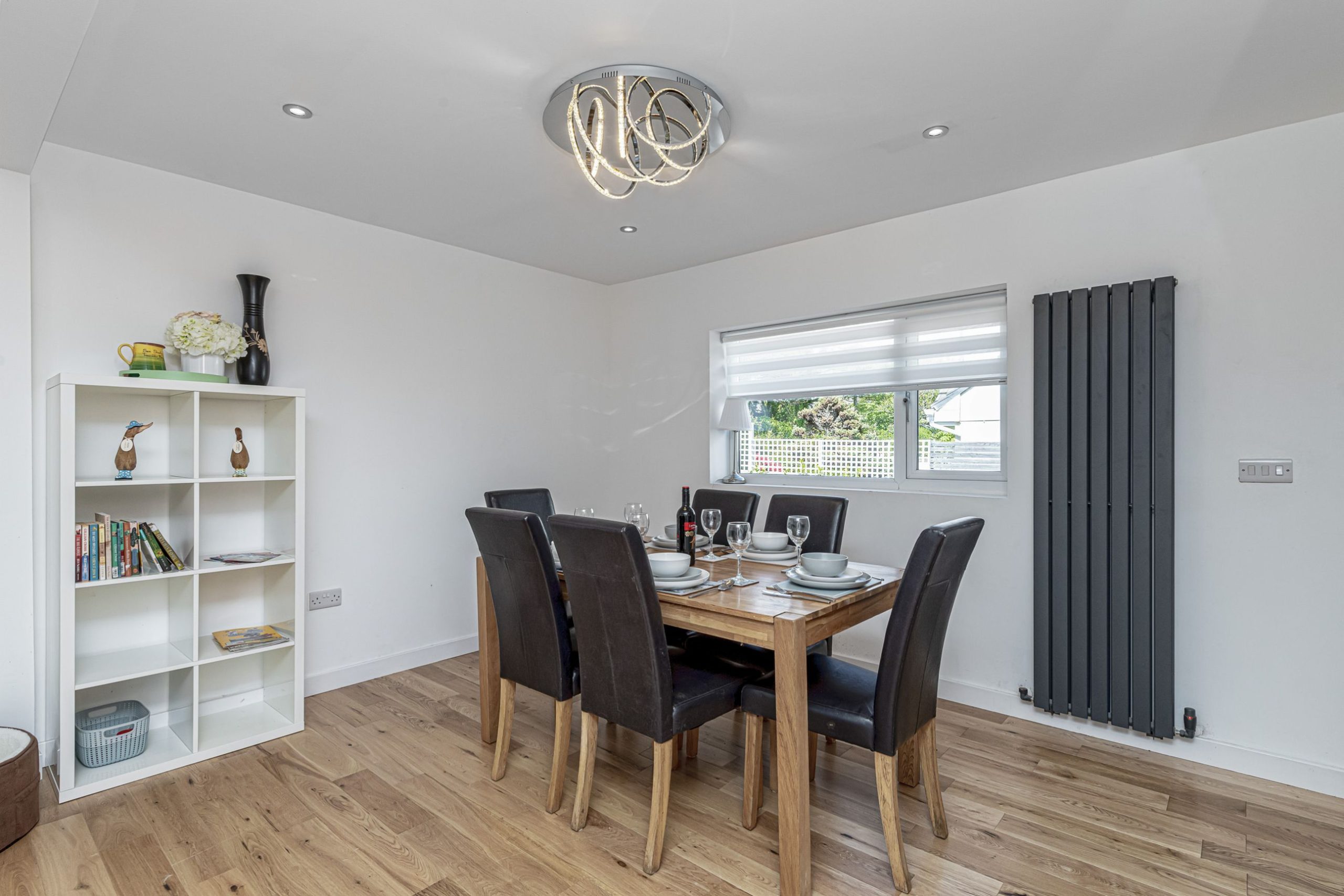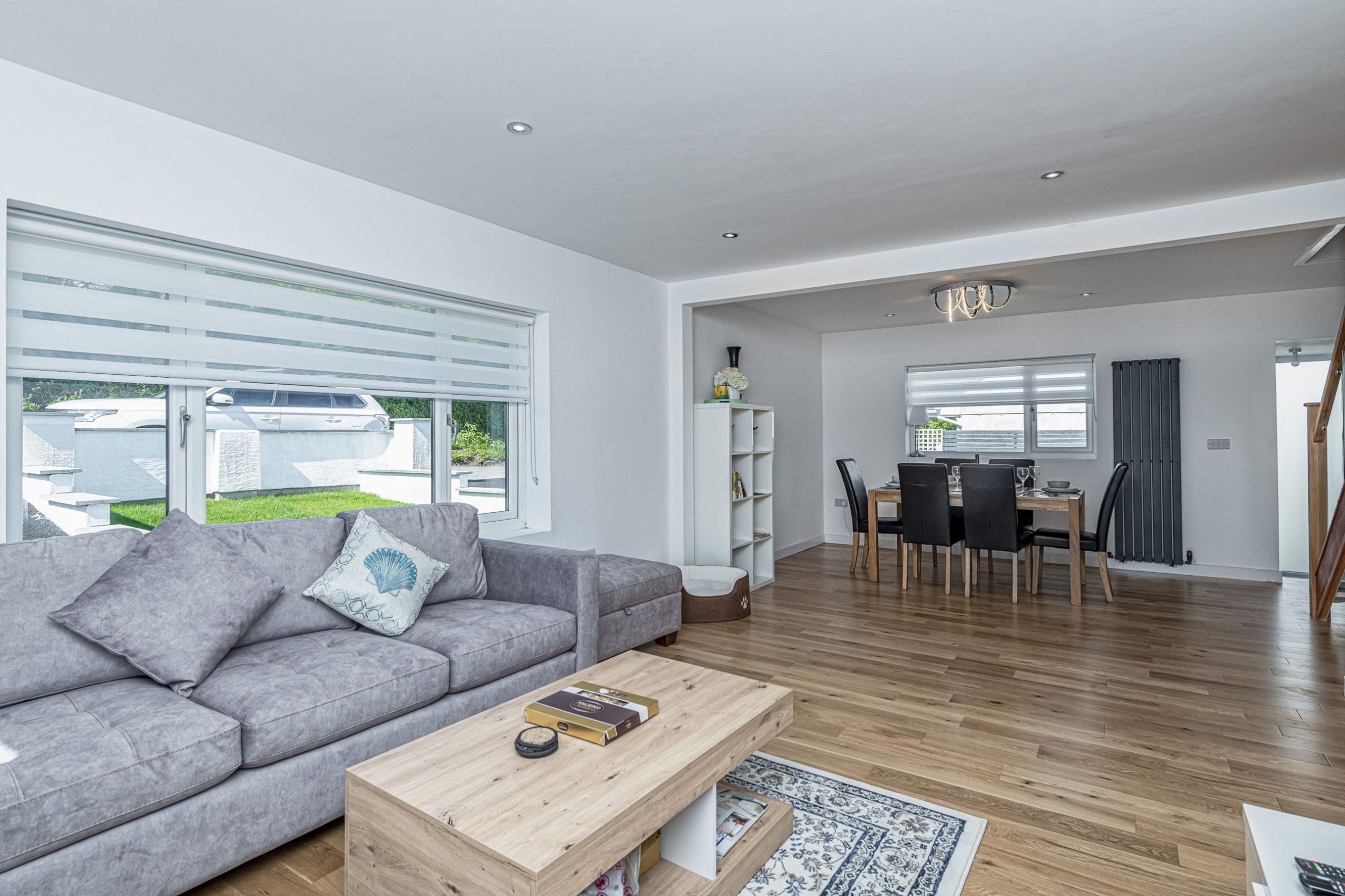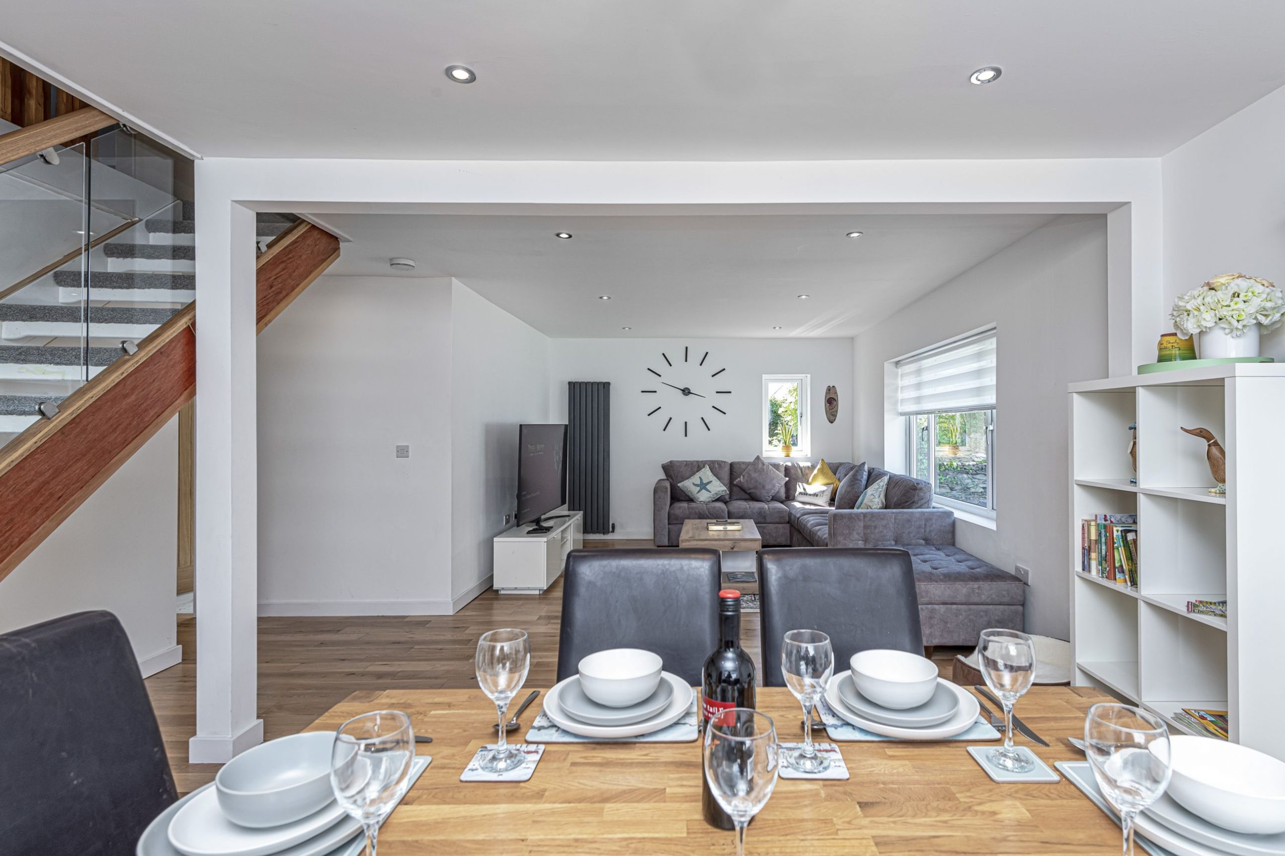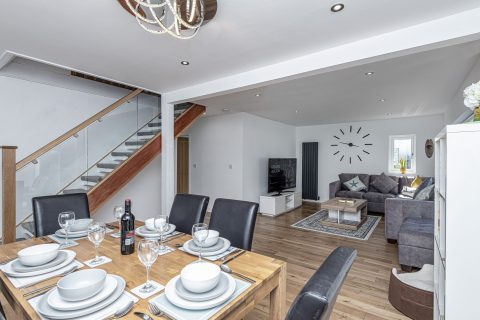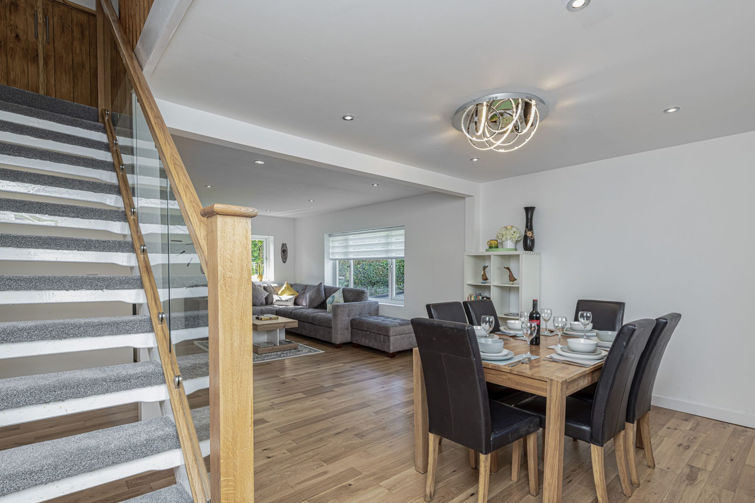 Next to the settees area in the open plan lounge, is the modern dining table and chairs area seats 8.