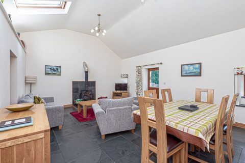 The back door leads out of the kitchen and offers level access to the parking area, and also to the well-sized utility/drying room. The utility/drying room houses a washing machine, tumble dryer plus an additional sink. There is plenty of room and underfloor heating here to dry your walking or fishing gear. This room is also space for secure storage, for your cycles, walking, or fishing gear. Outside the driveway brings you up to the parking space to the side of the house, to the front a patio with BBQ and lawned area give views over the lovely countryside to the mountains.