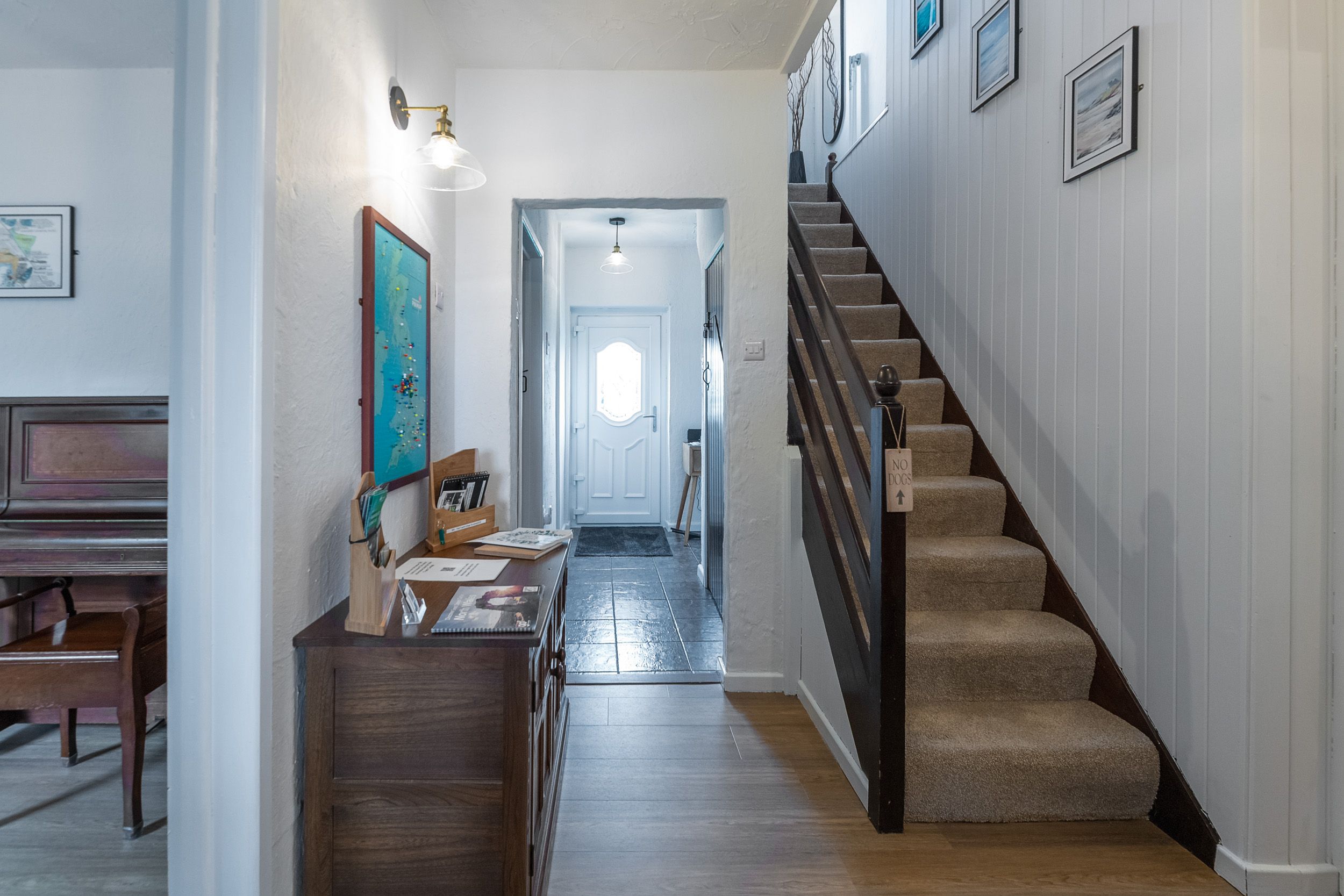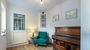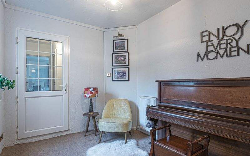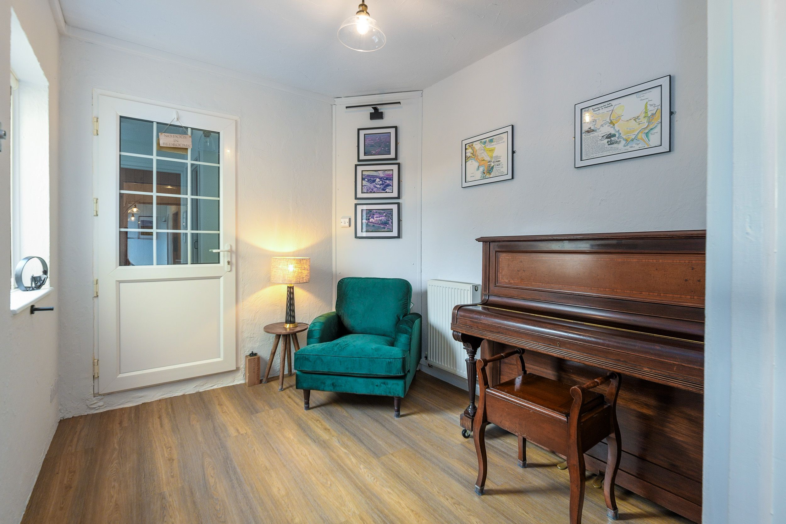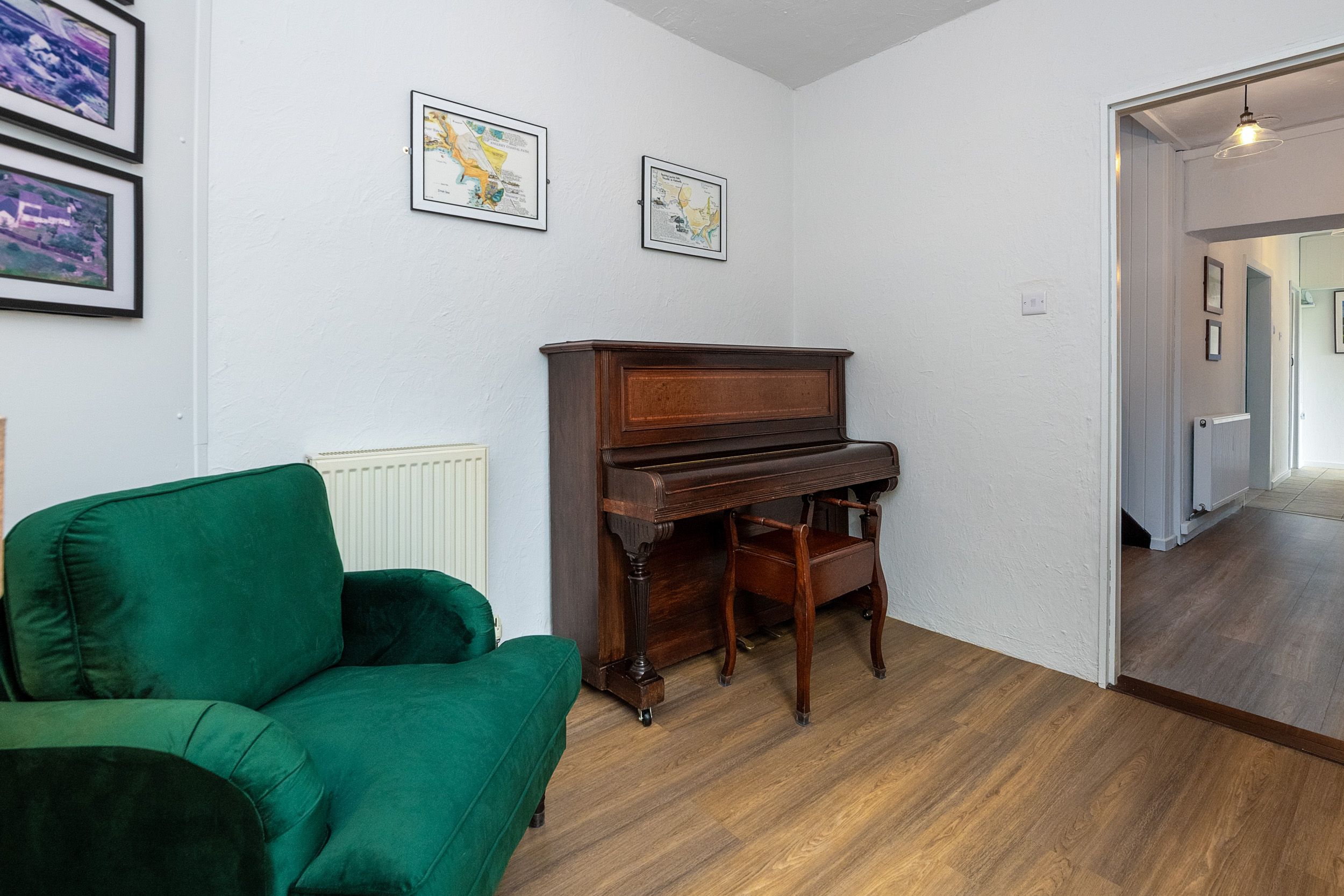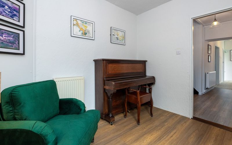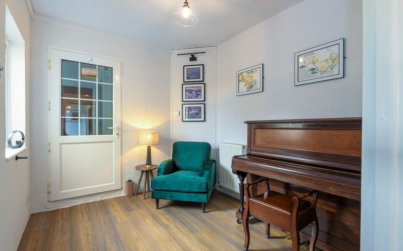 Along the corridor in the opposite direction is the snug, there is a piano in here and an occasional chair with lamp, creating a relaxing reading area.