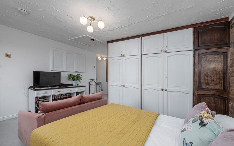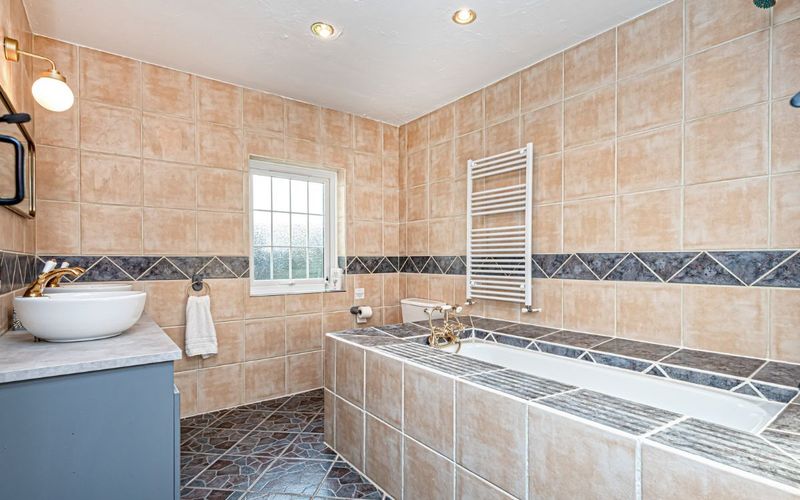 Walking through, there is a large family bathroom to your right, consisting of a bath with an electric shower above, a toilet and a double basin vanity unit with plenty of storage.