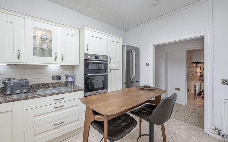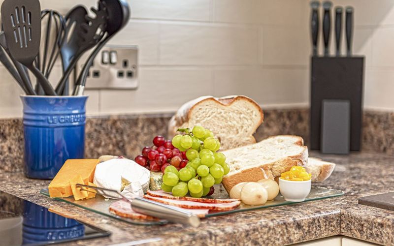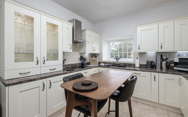 Along the ground floor corridor is a large modern kitchen with a fridge freezer, dishwasher, an eye level double oven, an induction hob, microwave, filter coffee machine, kettle, and toaster. The kitchen has been equipped to allow you to cook meals if you desire.