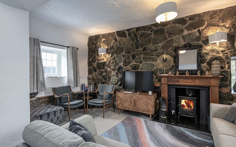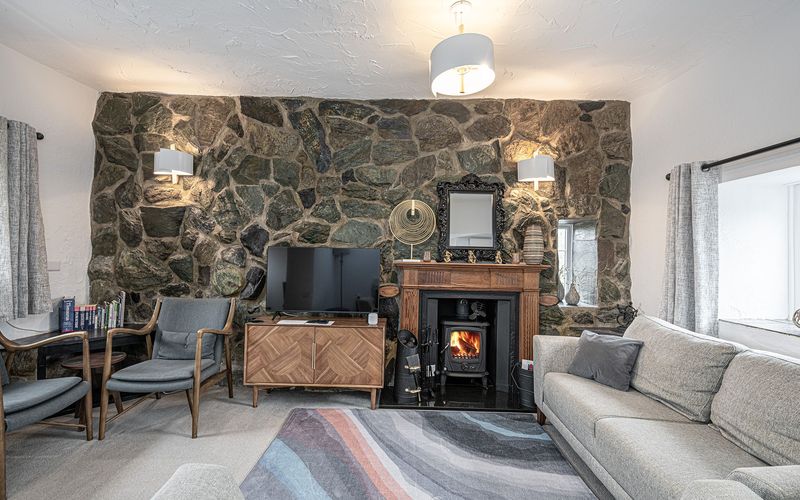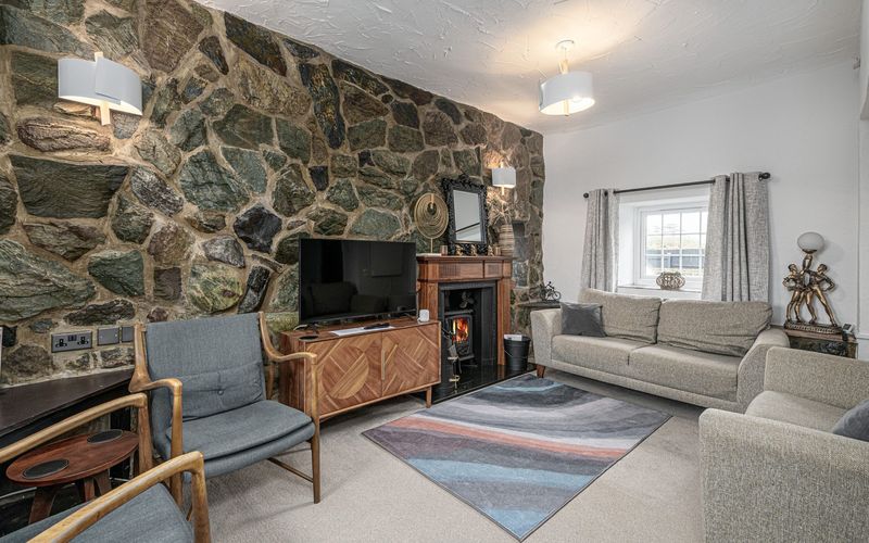 Next to the kitchen is the cosy lounge, with stone wall detail. This room is part of the original stone cottage built circa 1850. There is an Aga multifuel stove fitted and, if your arrival date is between 1st October and 24th March, a starter pack of smokeless coal and kindling will be left for you.
