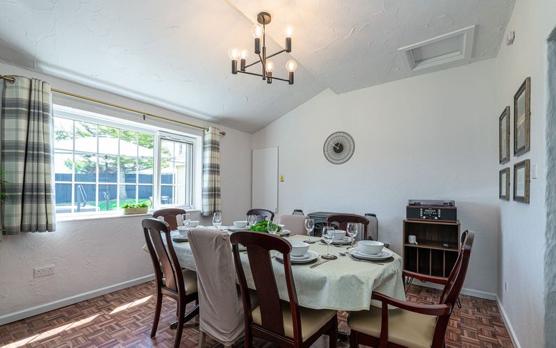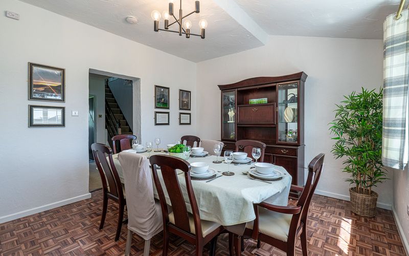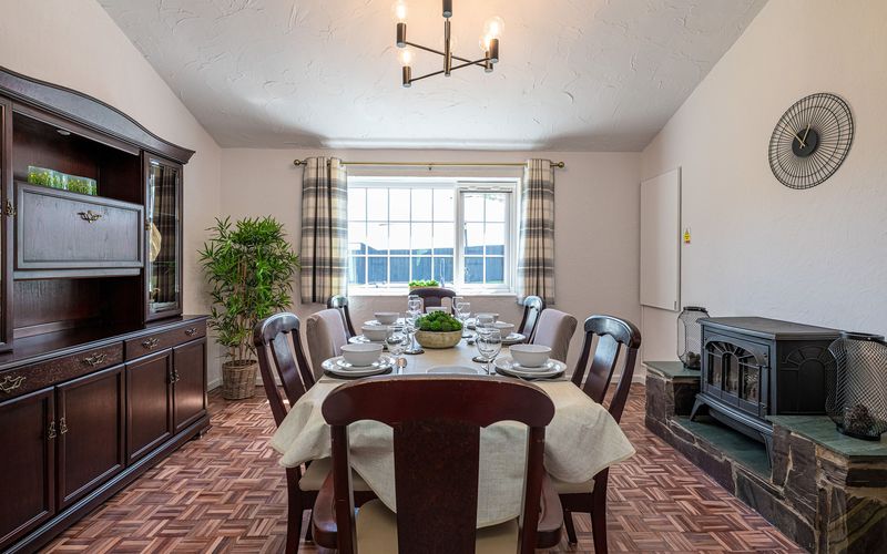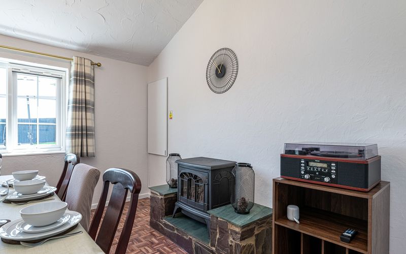 Straight ahead is the dining room with seating for eight people. There is a music centre available for your use so please feel free to bring your vinyl, CD’s or cassettes or connect to the rechargeable Bluetooth speaker. There is a gas fire in this room (please refer to instructions in the folder in the utility room) and an electric infrared wall panel heater.