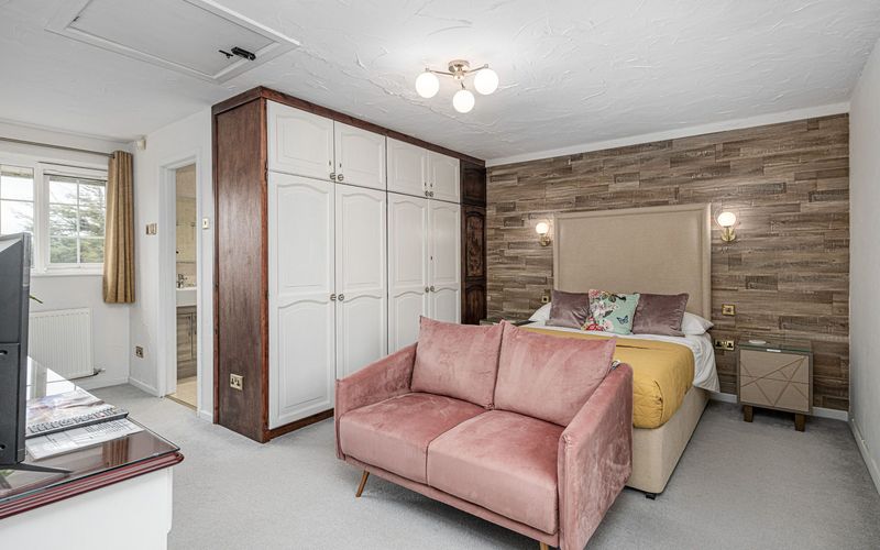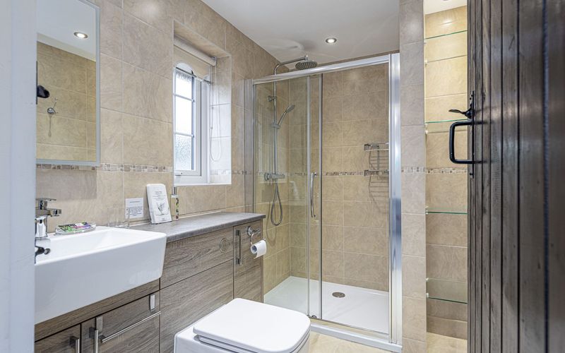 Opposite the dining room is the staircase to the first floor double bedroom. The bedroom is a large bedroom with a double bed, fitted wardrobes, a dressing table, sofa and a modern ensuite bathroom with double shower. There is a Smart TV with inbuilt freesat and a Google Chromecast fitted if you would prefer to cast from apps on your phone, laptop etc.