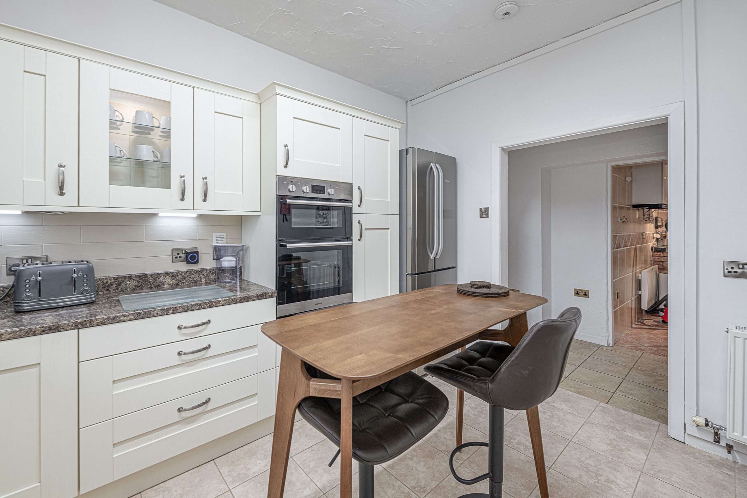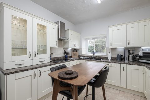 Along the ground floor corridor is a large modern kitchen with a fridge freezer, dishwasher, an eye level double oven, an induction hob, microwave, filter coffee machine, kettle, and toaster. The kitchen has been equipped to allow you to cook meals if you desire.