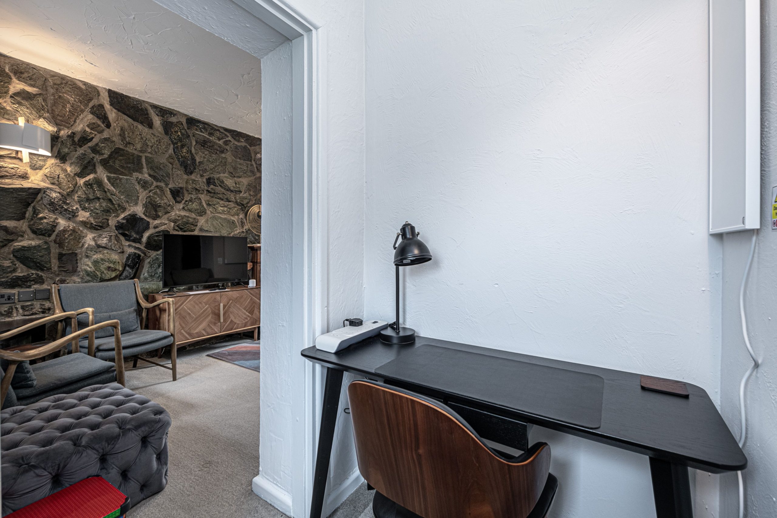 In the alcove (in the lounge) is a dedicated work space containing a desk, work chair, desk lamp and infrared wall panel heater.