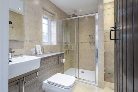 Walking through, there is a large family bathroom to your right, consisting of a bath with an electric shower above, a toilet and a double basin vanity unit with plenty of storage.