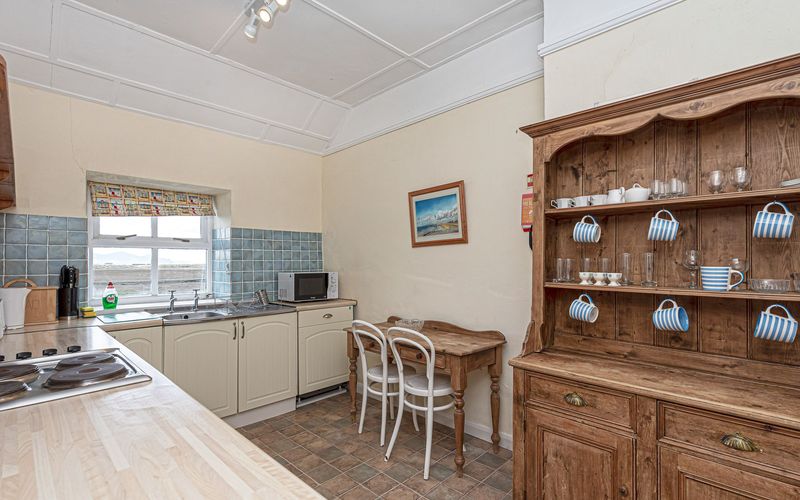 The up-to-date kitchen has views to the south over to distant hills. As well as the usual facilities, (though no dish-washer), there is a serving table and the crockery is displayed on a pine dresser.