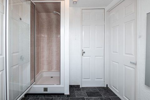 Main Bedroom: Includes a double and single bed with an ensuite shower, sink, and toilet beneath a skylight.