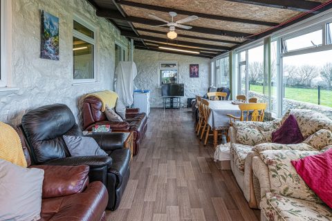 Conservatory with Sea Views: A comfortable conservatory with ample seating, a large TV, and stunning views across Caernarfon Bay and Holyhead Mountain. Watch ships passing along the horizon from this peaceful spot.