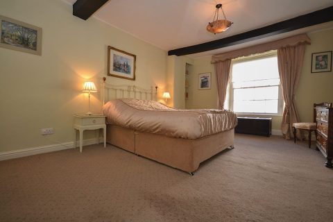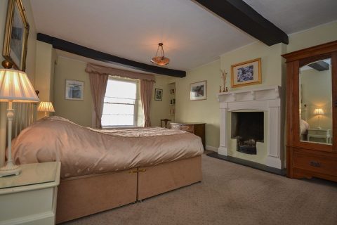 This attractive and spacious room benefits from a beamed ceiling and an imposing fireplace. It contains a double bed with ample storage space provided in the wardrobe, chest of drawers and an ottoman. There is a collection of books on the shelf.