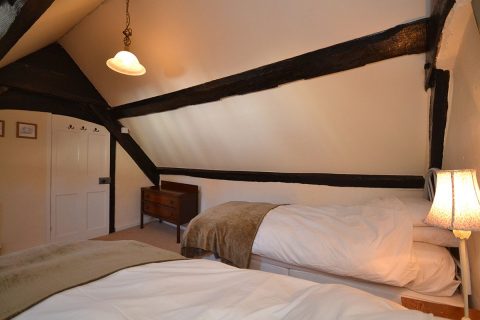 This twin bedroom (to which access is gained from Bedroom 5) contains two single beds, an antique chest of drawers and attractive roof beams.