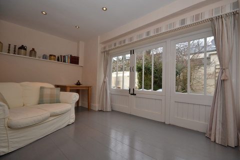 Off the kitchen is a cosy room with attractive painted floorboards and large patio doors that open on to the outside courtyard. There is comfy sofa which makes it perfect for a relaxing morning coffee. Stairs lead to bedroom 1, with its own private bathroom on the first floor.