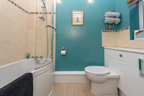 Complete with bath and overhead shower, loo basin , heated towel rail and storage, situated off the front hall.