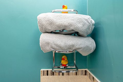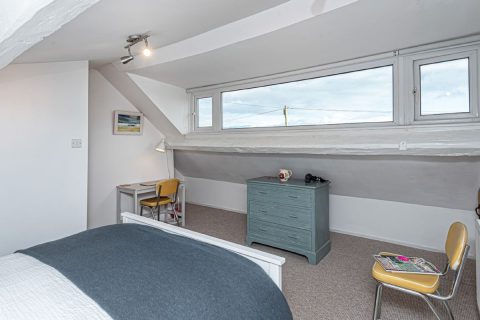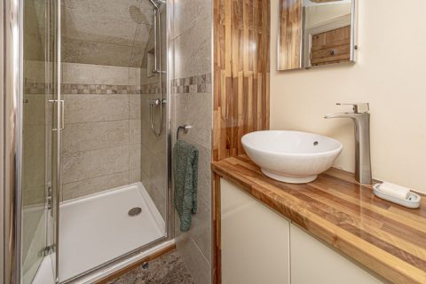 Stairs lead up to Master bedroom & ensuite with stunning views across the marshland to the distant Snowdonia mountain range – it will be difficult to pull yourself away! King size bed with bedside tables and lamps, small desk suitable for laptop use, chest of drawers, chair and cupboard with hanging space. Ensuite shower room with basin, loo and heated towel rail.