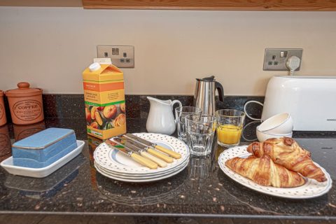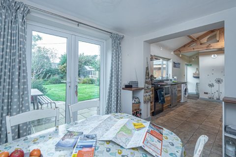 Fully equipped hand made kitchen with view over the garden. Includes electric cooker with induction hob, fridge freezer, microwave, dishwasher, toaster, radio and all you would expect to find! French doors lead out from dining area to patio and there is also a back door with coat hooks .