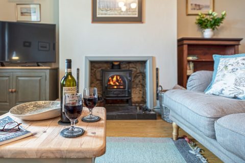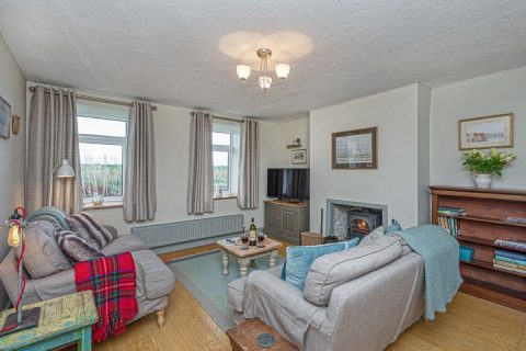 An inviting room with 2 two seater sofas to relax on after a busy day exploring. Freeview TV. Cosy woodburner with a few logs for your first night. Distant views through the beautiful front garden grasses across to the mountains.