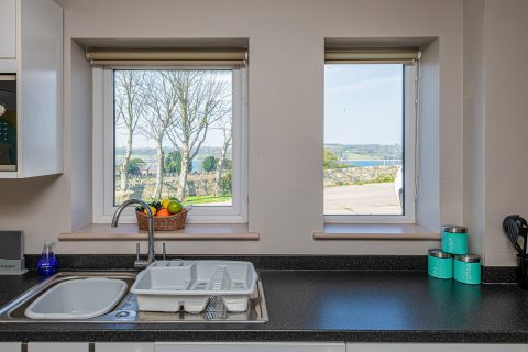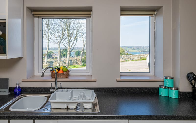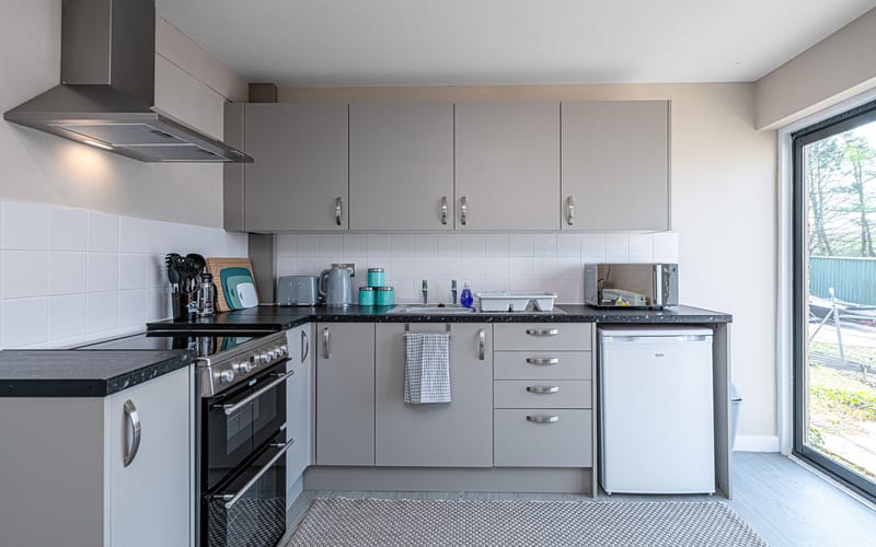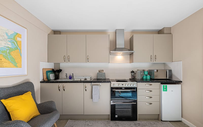 Kitchen: Compact yet fully equipped, featuring an under-counter fridge, freezer, cooker, and microwave