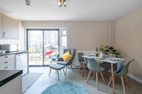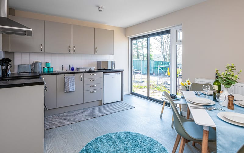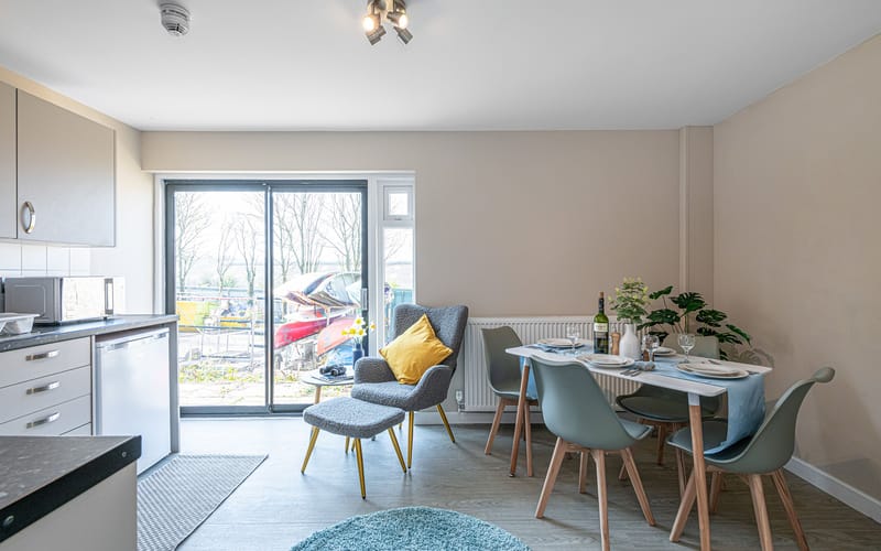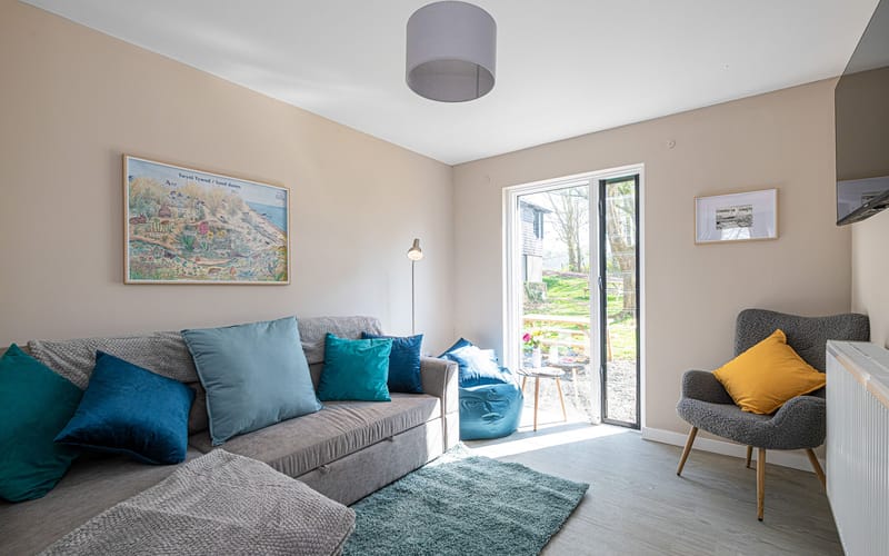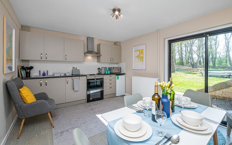 Outdoor Space: Small patio area with picnic table, plus access to Plas Menai’s outdoor grounds, mountain bike track, and cycle pump track