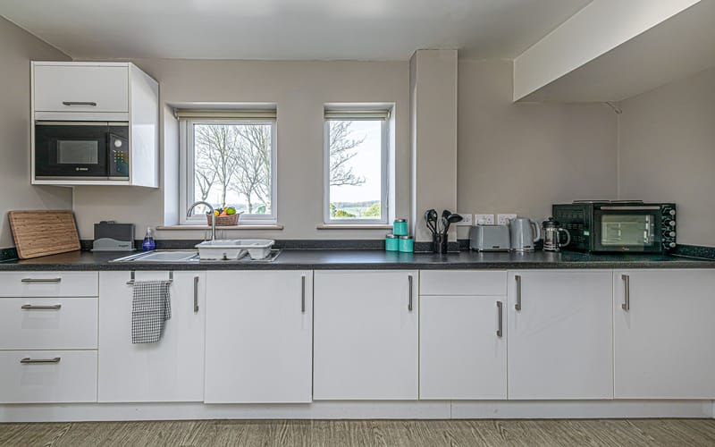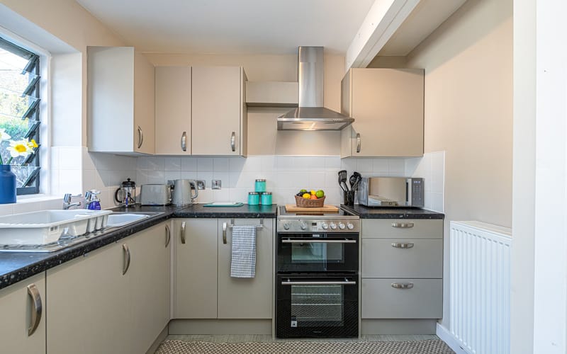 Kitchen: Fully equipped with an under-counter fridge, cooker, and microwave