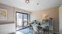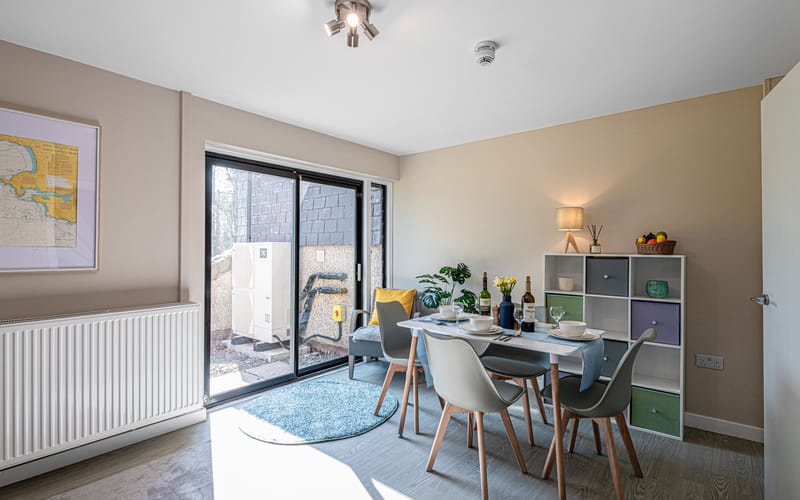 Living / Dining Area: Open-plan space with a dining table seating 8, Smart TV, and patio doors leading to a small outdoor seating area with picnic table