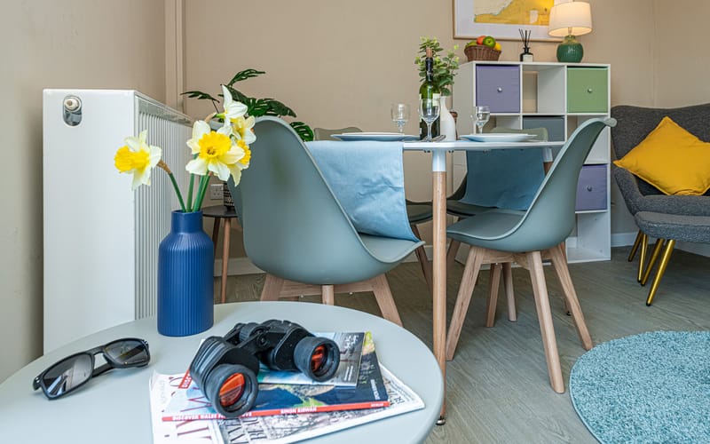 Living / Dining Area: Comfortable lounge area with sofa bed and Smart TV, plus a dining area for 8