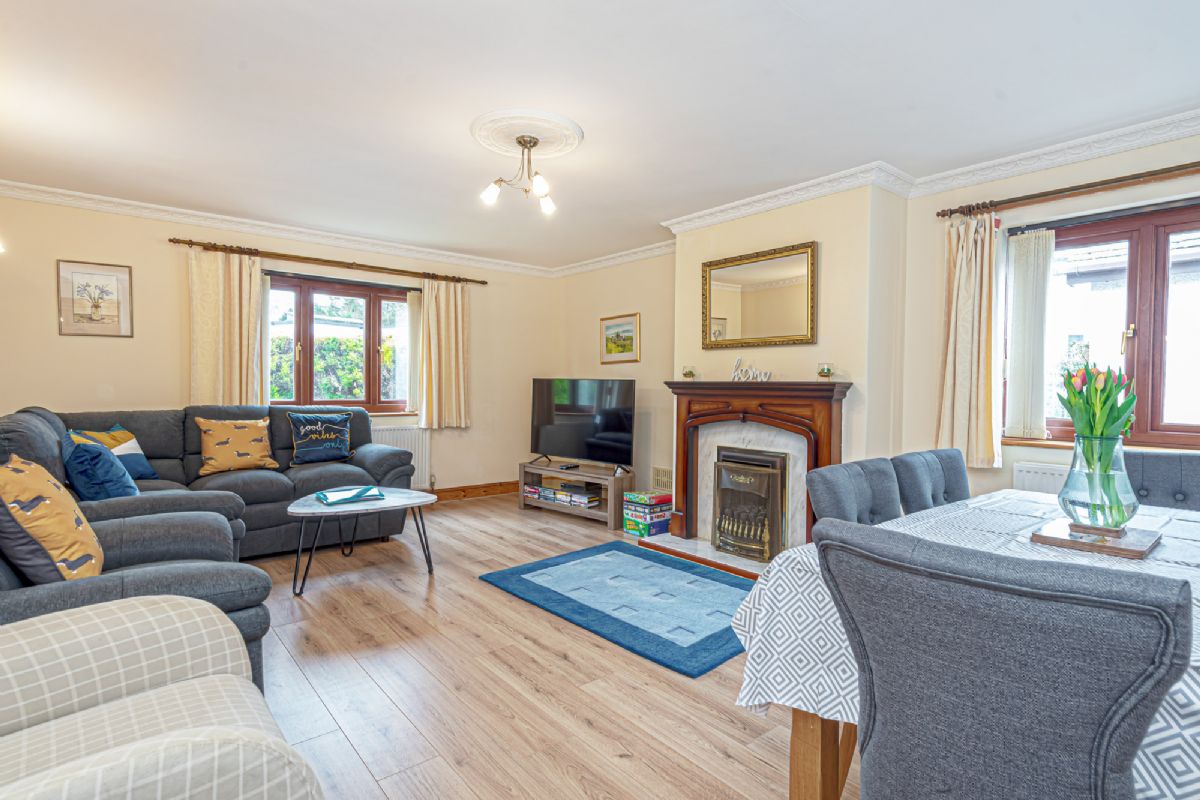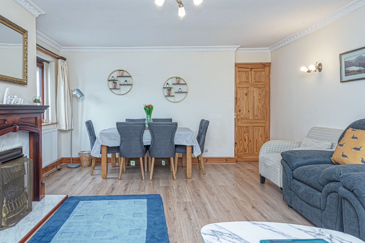 This spacious lounge boasts a comfortable corner sofa, two armchairs, coffee table, 55in Smart TV with a DVD player and Freeview. The traditional inset gas fire, provides extra warmth if needed. There is a selection of DVDs available next to the DVD player. There is a dining table with 6 chairs.