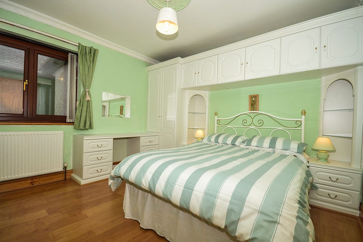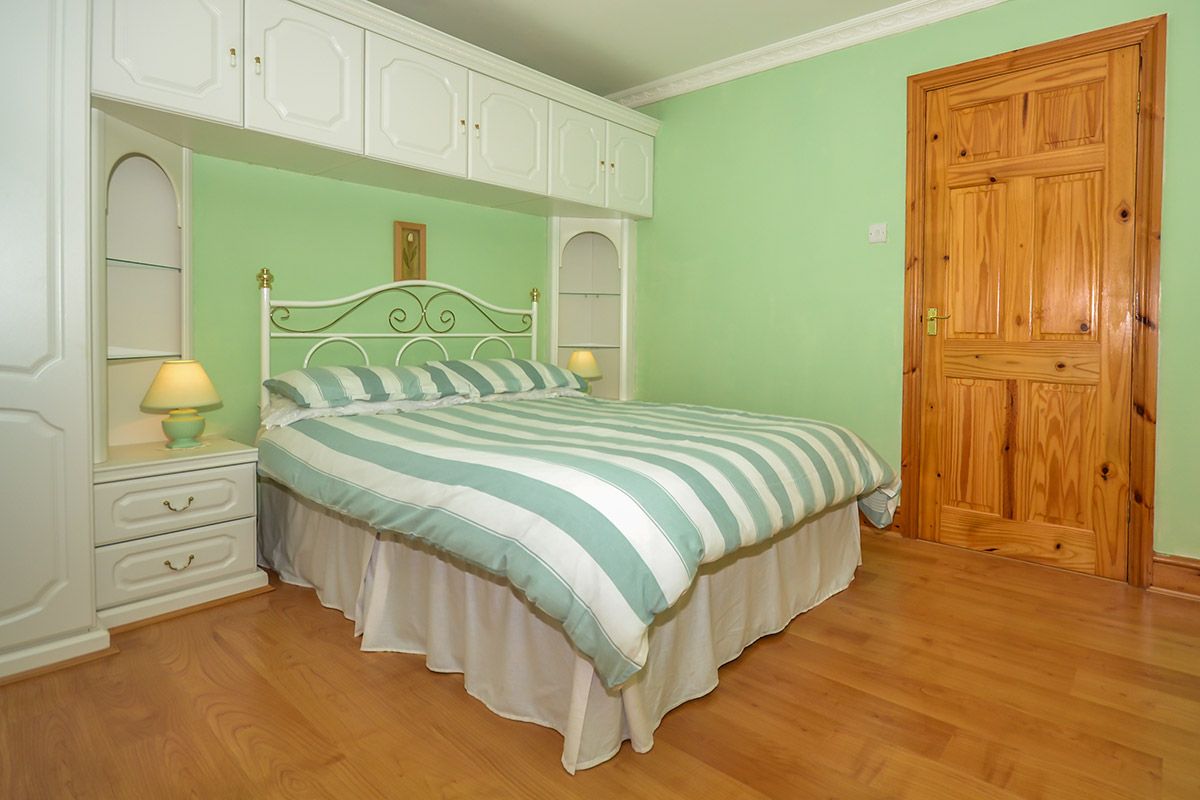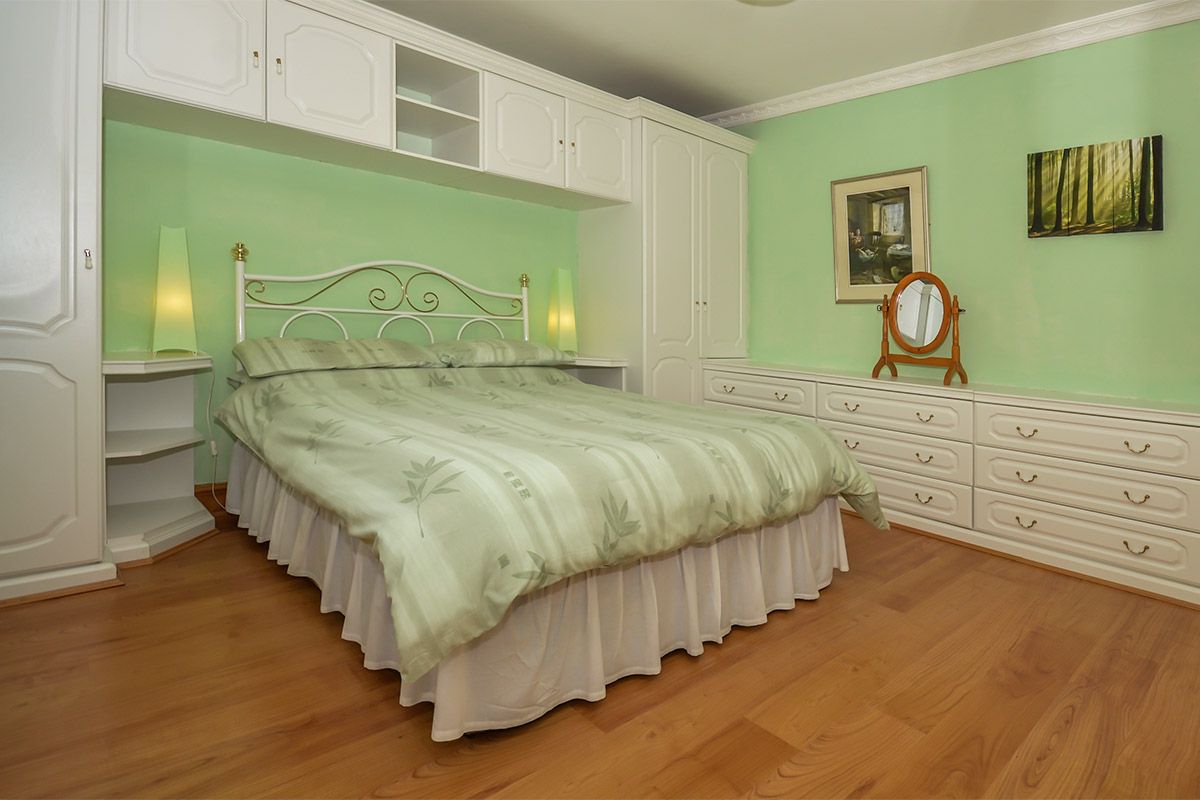 This double bedroom contains a double bed, a built in wardrobe and cupboards, providing lots of storage space.