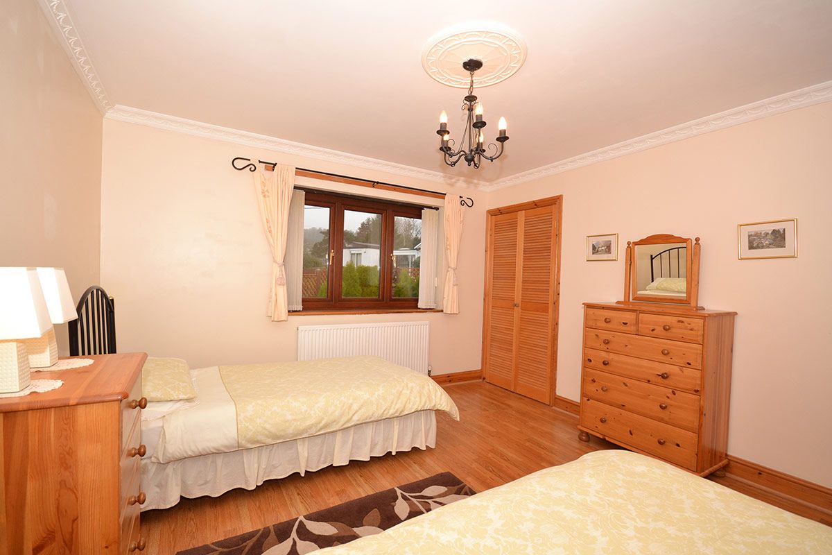 The twin bedroom has two single beds, a bedside cabinet, chest of drawers and a built in wardrobe.