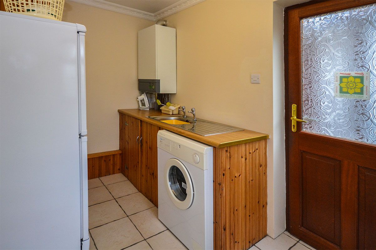 The utility room has a standing fridge/freezer, utility sink and a washing machine.