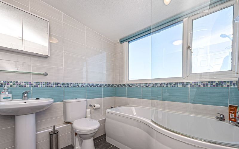 The P shaped shower bath provides the convenience of a spacious shower with the luxury of a bath. A wash basin, toilet, heated towel rail and probably the best view from a shower in the world, complete this attractive modern bathroom!