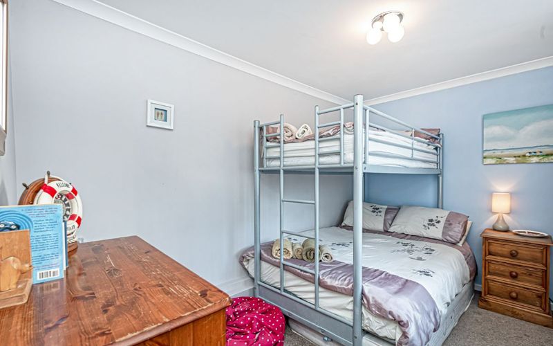 Ground floor bedroom that sleeps three in a triple bunk – a single over lower double bed. There is a bedside cabinet and a set of chest of drawers that provide plenty of clothing storage.
