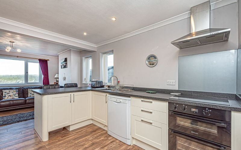 Well equipped recently refurbished kitchen with microwave, induction cooker with electric oven, toaster, kettle, fridge, freezer, pots, pans, tea, coffee. etc. Superb view of the sea from the kitchen. Breakfast bar with 2 bar stools facing the kitchen.